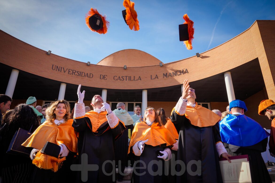 Dirigiéndose a los nuevos doctores, recordó el apoyo con el que cuentan desde la Escuela Internacional de Doctorado, desde donde se gestionaron durante el curso 2022-2023 1633 matrículas, de las que 359 fueron de nuevo ingreso. “Vuestras directoras y directores de tesis han contribuido además al crecimiento de la comunidad científica castellanomanchega, que en 2023 logró para nuestra universidad la financiación más alta de su historia en proyectos competitivos de investigación”. En su felicitación, tuvo una mención especial para Francisco González de Posada, que cuenta en su haber con nueve doctorados.