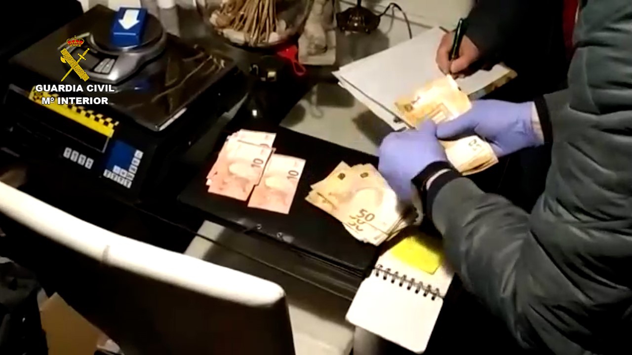 – 27.405 euros en efectivo, supuestamente de la venta de la droga.