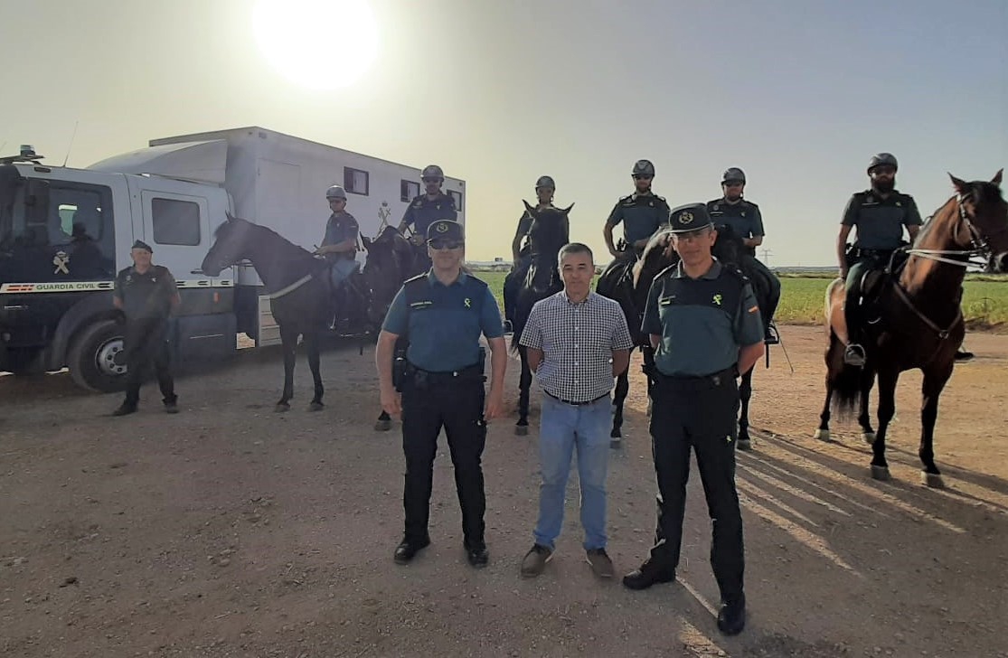 El subdelegado del Gobierno, Miguel Juan Espinosa, acompañado por el teniente coronel de la Comandancia de Albacete, Jesús Manuel Rodrigo, y por el capitán de la 2º Compañía, Esteban Marco, han visitado esta mañana el despliegue realizado por los agentes procedentes del Escuadrón de Caballería de Valdemoro, con el objetivo de reforzar la vigilancia en el campo de las campañas agrícolas en la provincia durante este verano.