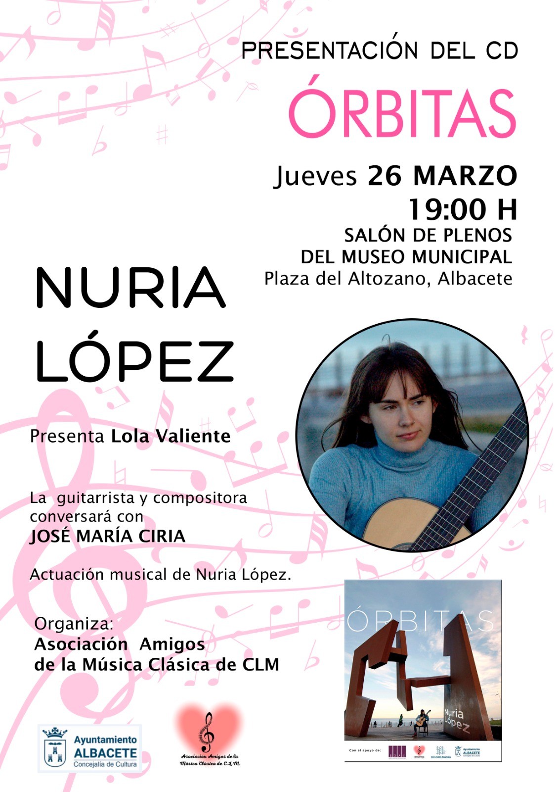 Este jueves, a las siete de la tarde, el Salón de Plenos del Museo Municipal, en la Plaza del Altozano, la guitarrista y compositora albaceteña Nuria López presenta su primer CD, Orbitas.