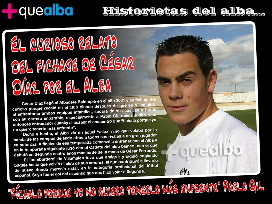 César Díaz llegó al Albacete Balompié en el año 2001 y su fichaje fue curioso porque recaló en el club blanco después de que en Villamalea, al enfrentarse ambos equipos infantiles, sacara de sus casillas a todos con su carrera imparable, especialmente a Pablo Gil, quien le dijo a su entonces entrenador Juanky al acabar el encuentro que «fíchalo porque yo no quiero tenerlo más enfrente».