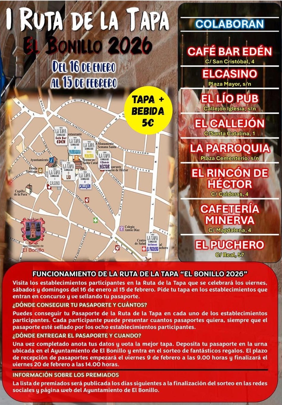 El Ayuntamiento de El Bonillo pone en marcha la I Ruta de la Tapa, una propuesta que nace con el objetivo de animar las calles del municipio, apoyar a la hostelería local y ofrecer un plan atractivo para disfrutar del pueblo de otra manera. La Ruta se celebrará del 16 de enero al 15 de febrero, durante los viernes, sábados y domingos, convirtiendo cada fin de semana en una invitación a salir, compartir y saborear.