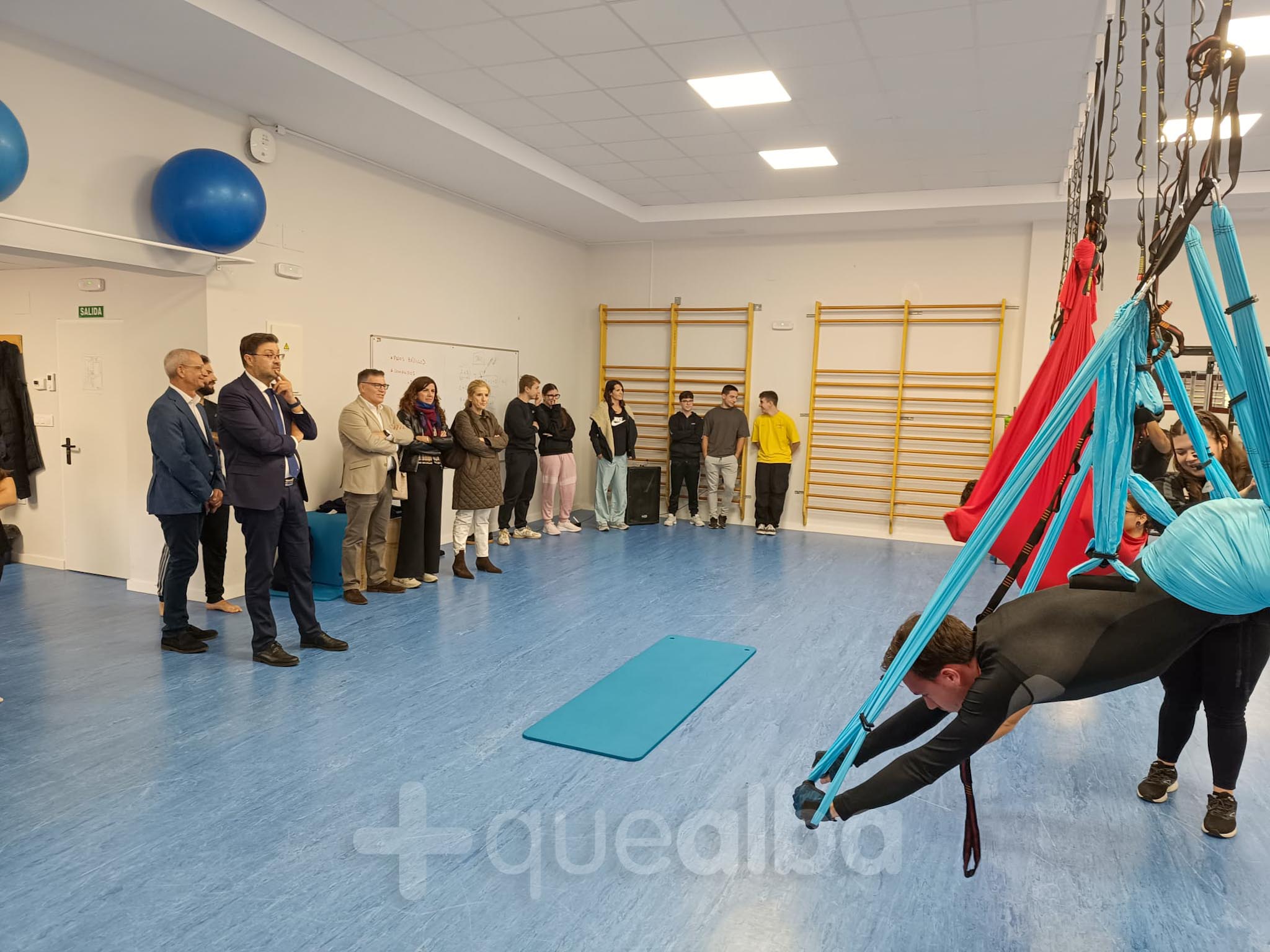 Pastor y Pérez han visitado, además, el taller técnico del ciclo formativo de grado superior de Acondicionamiento Físico, lugar en el que los alumnos le han hecho una pequeña exhibición de acrobacias aéreas.