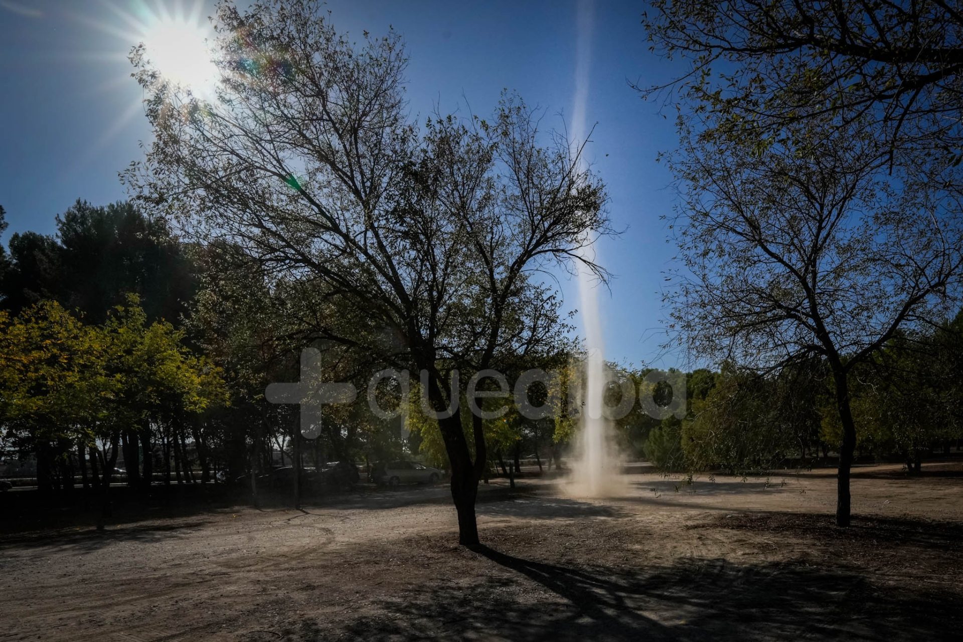 Curiosa y algo inquietante fotografía la que hemos captado, este mediodía, en el parking del Cementerio de Albacete. En una jornada con temperaturas prácticamente estivales, un ‘mini tornado’ sorprendía en la zona de tierra, en este Día de los Difuntos.
