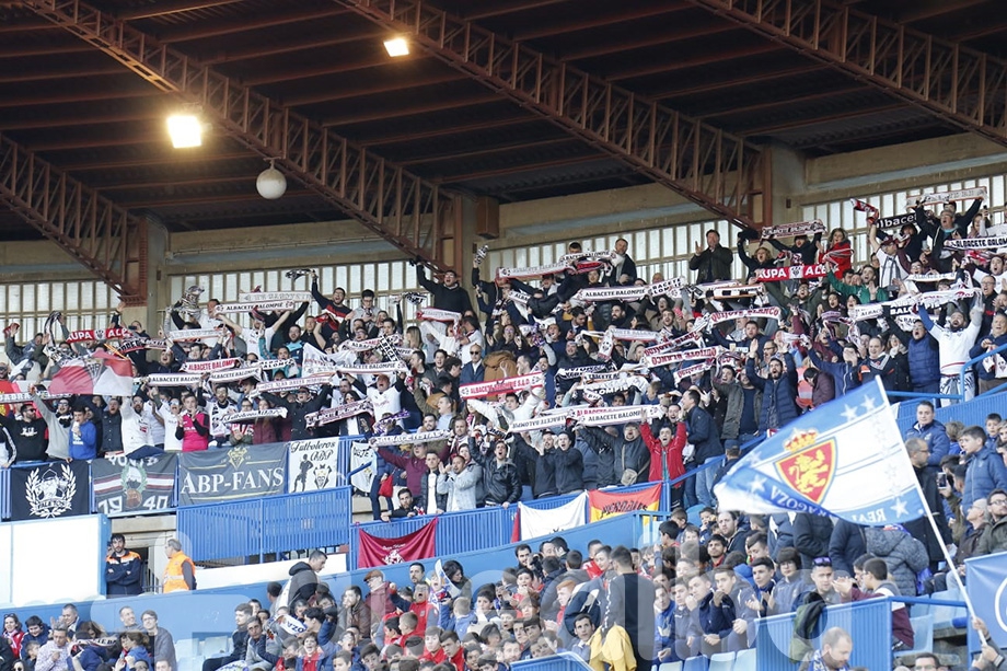 Unos 500 aficionados del Albacete Balompié animan a los de Luis Miguel Ramis en las gradas de La Romareda.