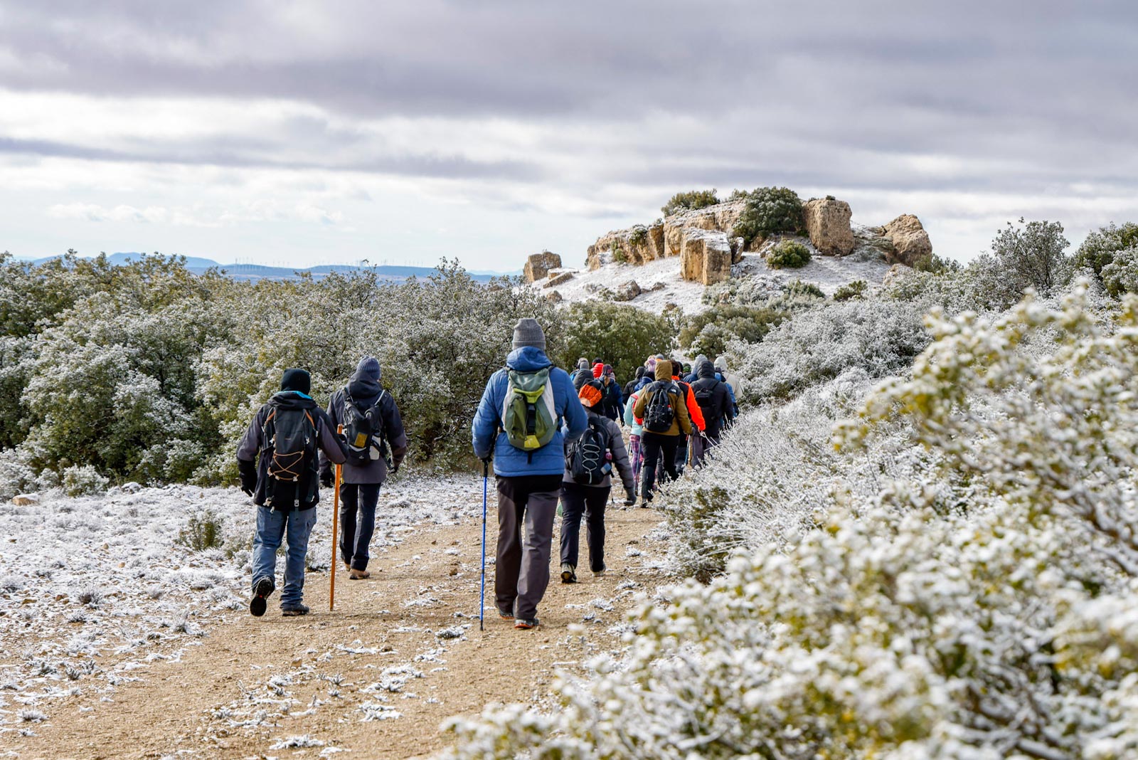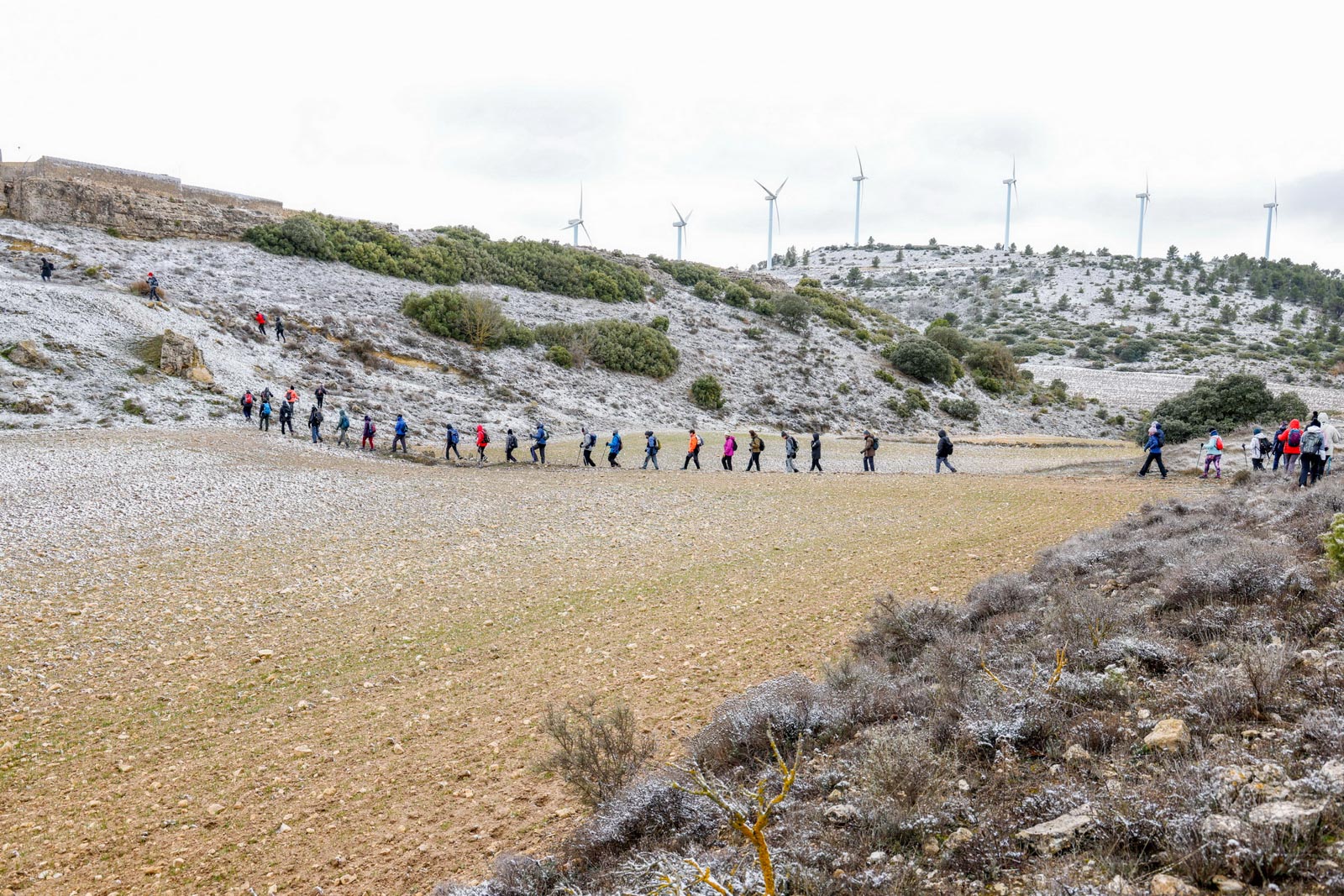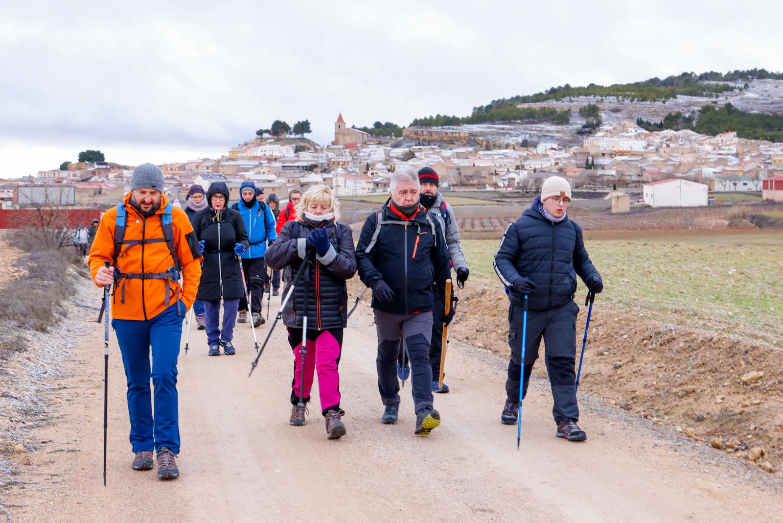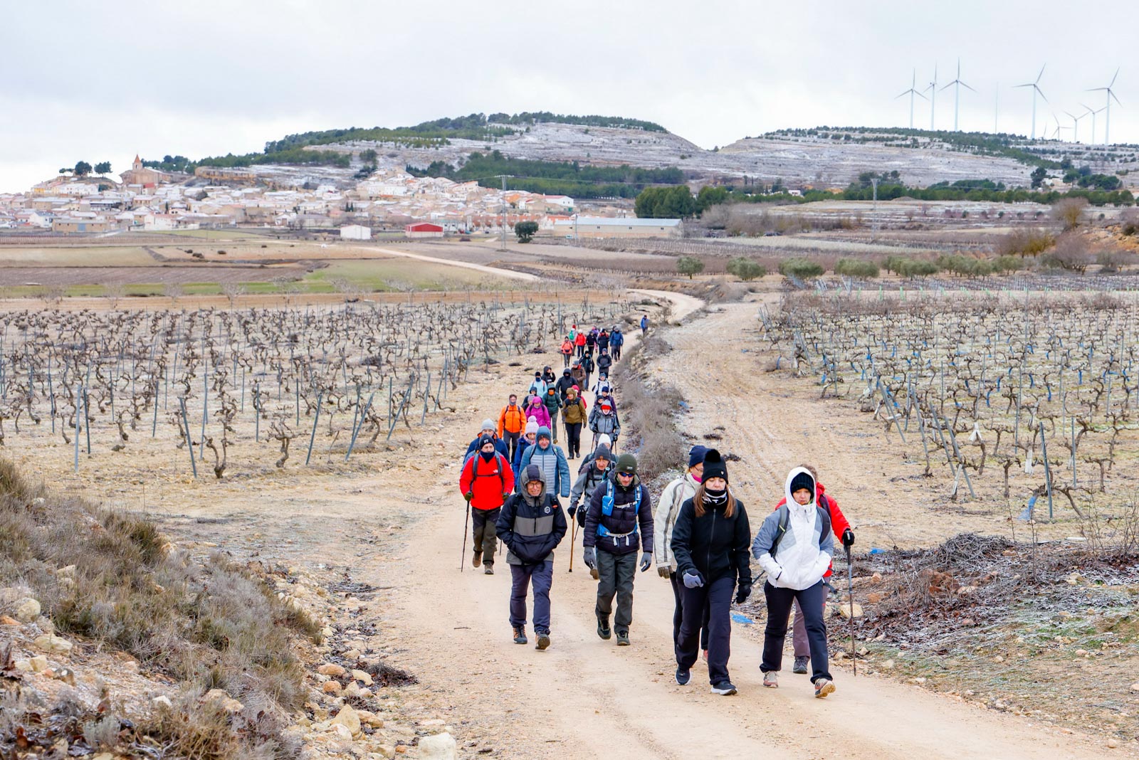 Alrededor de las nueve arrancaron la marcha, para abandonar el pueblo, por el camino del Cenajo. Las montañas de destino al fondo cubiertas de nieve, al igual que parte de los campos que ibas atravesando, por lo que el frio se hacía notar, aunque como iban subiendo de una manera muy suave, se iban calentando.