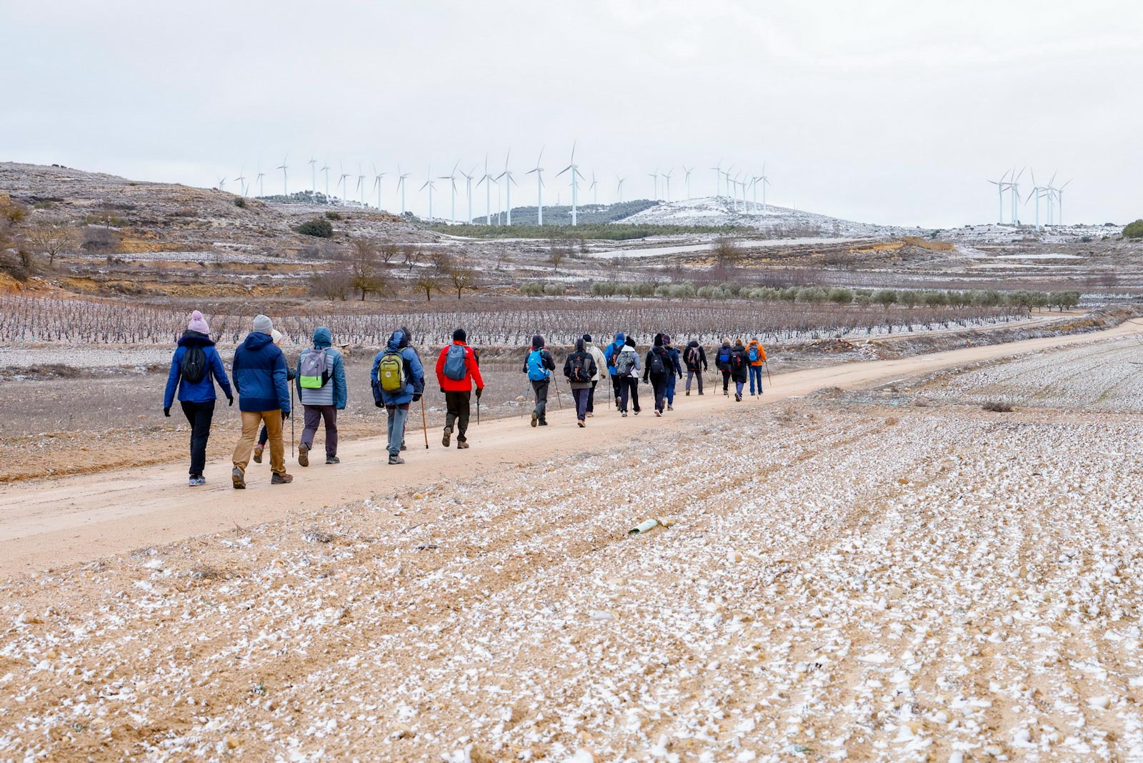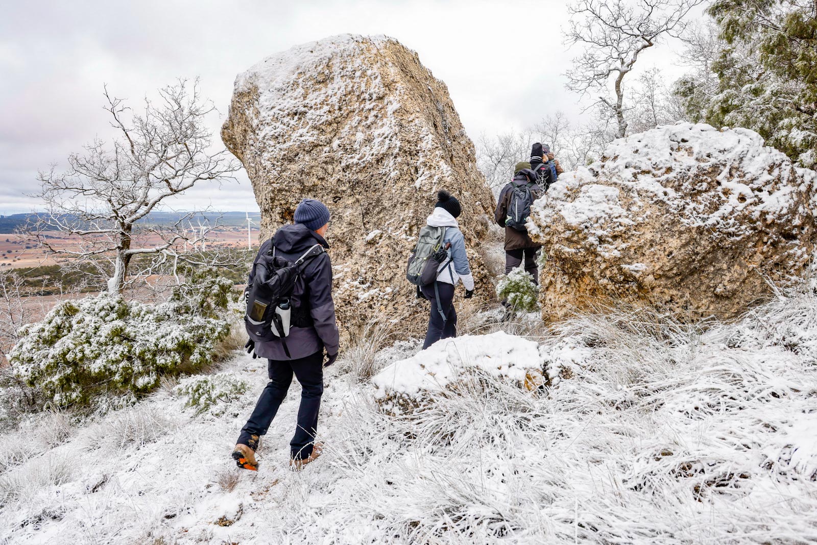 Girarían hacia la izquierda para coger el camino del Barranco, atravesando el “Retamalico”, paraje de viñedos de garnacha tintorera, en esta ocasión cubiertos de nieve. Antes de llegar a la casa del Barranco la ruta se desvía a la izquierda, subiendo hacia el corral del “Artista” hasta coger el camino de los “Lagrimales”. Seguirían poco a poco ascendiendo hasta el paraje de “la Carrasquilla”, rodeados de un paisaje en el que se mezclan encinas, pinos y cultivos de cereal y viñedo.