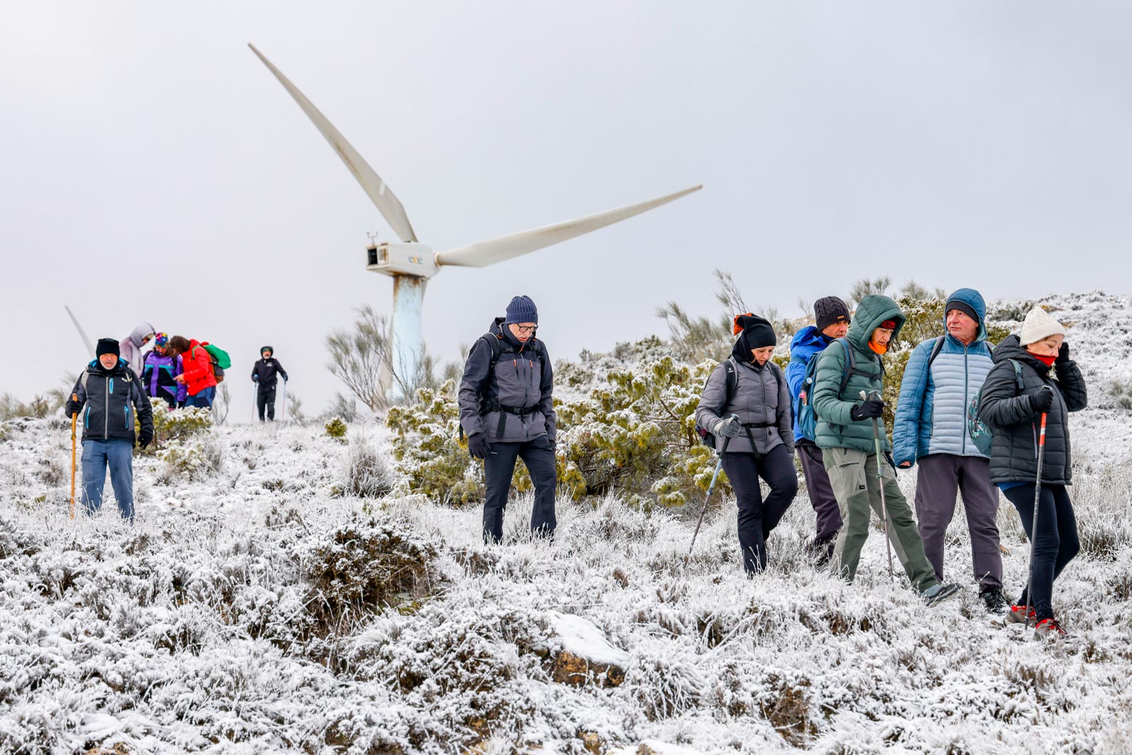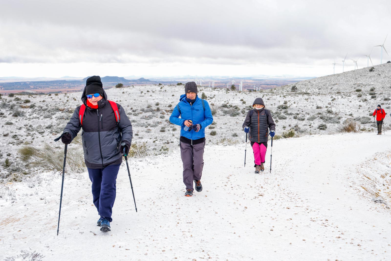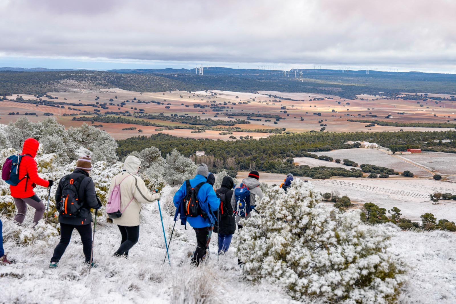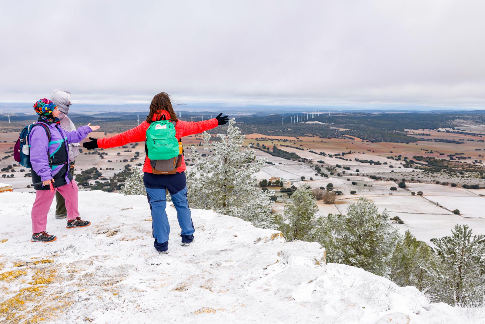Aparecerían los aerogeneradores al aproximándose a la cima, y el viento ya se hacía notar, sobre todo al salir del pinar, al llegar a la parte más elevada, totalmente cubierta de nieve, donde se sitúa el pico del Mojinete (1.245 metros), mayor altura de la mitad norte de la provincia de Albacete, desde donde se pueden contemplar unas vistas espectaculares. Aquí, resguardados del viento, pudieron entran en calor gracias a un café calentito, junto a unos ricos dulces de la zona, un detalle del Ayuntamiento de Higueruela, todo un lujo.