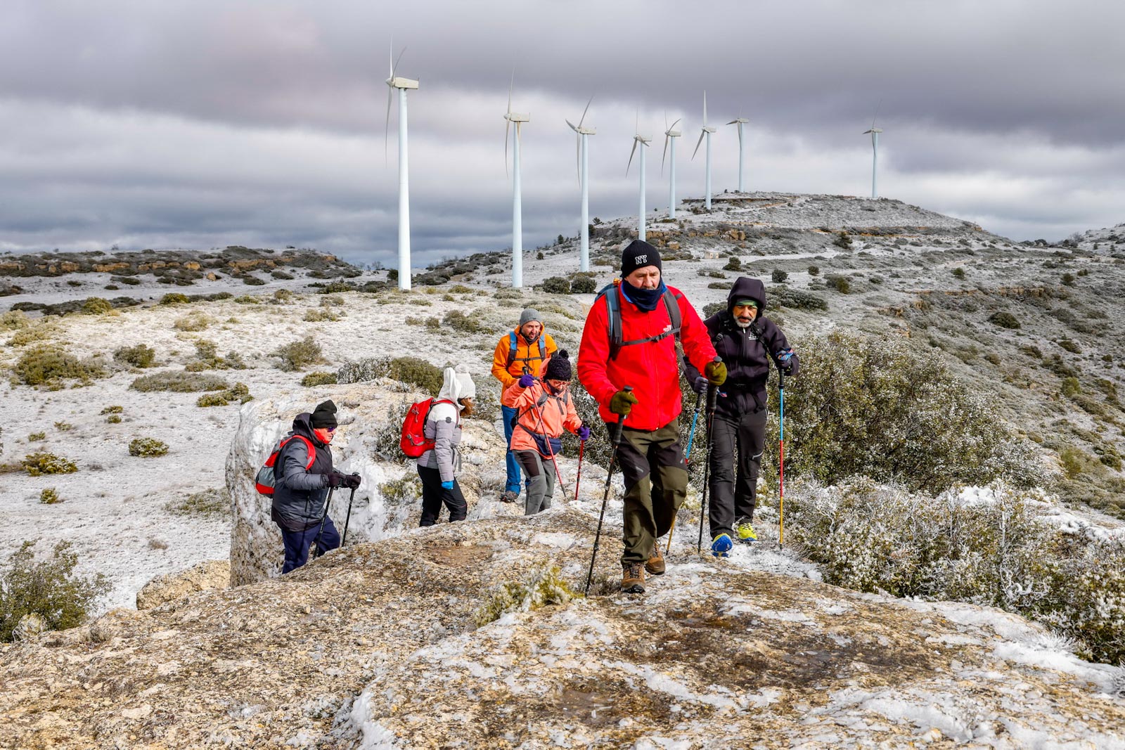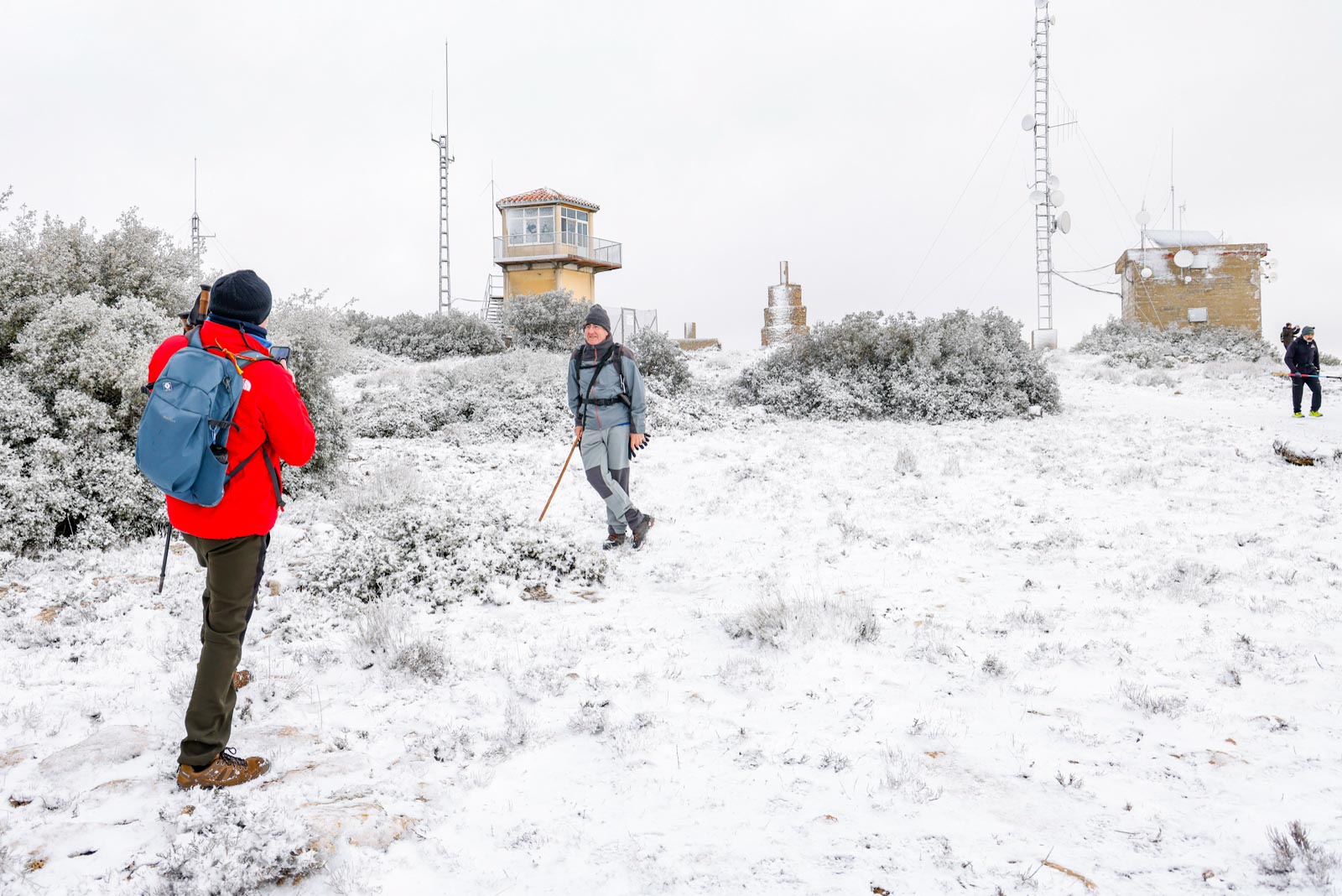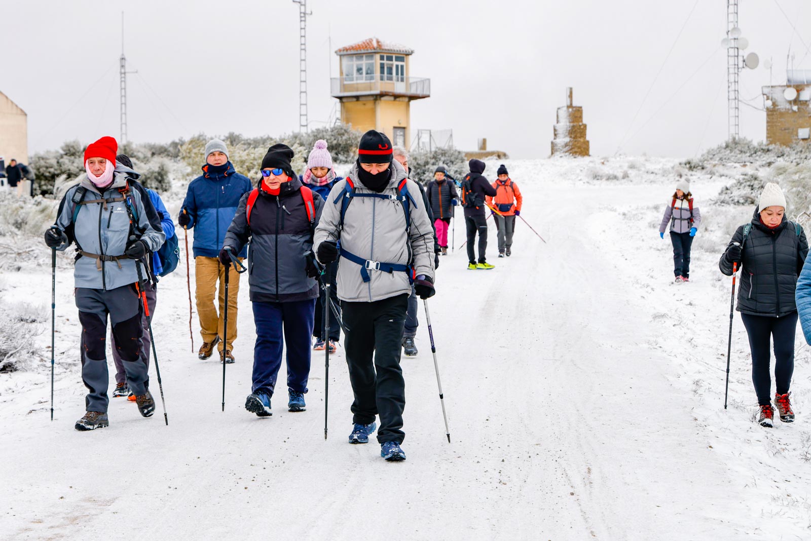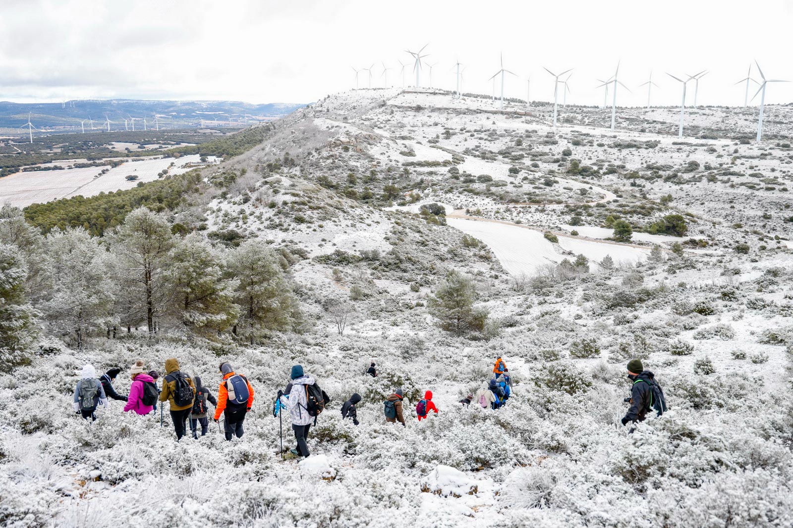 Aparecerían los aerogeneradores al aproximándose a la cima, y el viento ya se hacía notar, sobre todo al salir del pinar, al llegar a la parte más elevada, totalmente cubierta de nieve, donde se sitúa el pico del Mojinete (1.245 metros), mayor altura de la mitad norte de la provincia de Albacete, desde donde se pueden contemplar unas vistas espectaculares. Aquí, resguardados del viento, pudieron entran en calor gracias a un café calentito, junto a unos ricos dulces de la zona, un detalle del Ayuntamiento de Higueruela, todo un lujo.