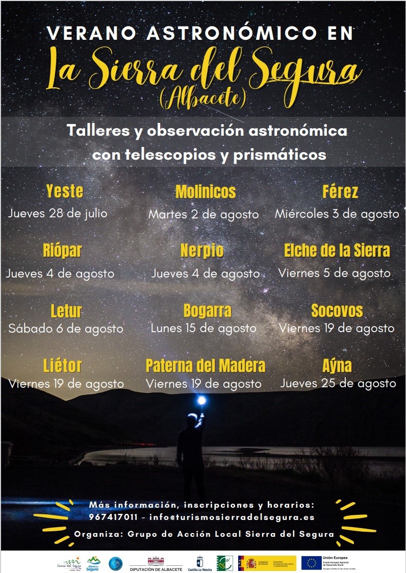 Desde este jueves, 28 de julio, y hasta el próximo 25 de agosto, las 12 localidades que conforman la comarca de la Sierra del Segura acogerán distintos e interesantes talleres de observación astronómica, con telescopios y prismáticos, dentro de la iniciativa ‘Verano Astronómico en La Sierra del Segura’.