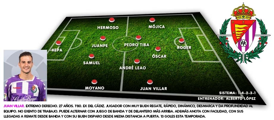 Intercalan dichas acciones con velocidad o directas, con algunas posesiones un poco más largas, donde el objetivo principal es entrar por bandas, con dos jugadores de mucha profundidad y desborde, como son Juan Villar, el ex del Cádiz en banda derecha, o el colombiano Mojica en la izquierda, los cuales dan mucha amplitud al juego de ataque pucelano, siendo auténticos “puñales” por fuera.