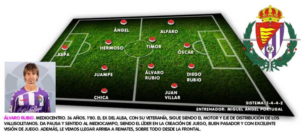 - Alfaro. Extremo. 29 años. 1’73. Jugador que tuvo su momento de gloria hace años ascendiendo con el Tenerife a primera y luego en el Mallorca y Sevilla. En el Valladolid está jugando de extremos izquierda. Jugador hábil en el uno contra uno y con mucho gol.