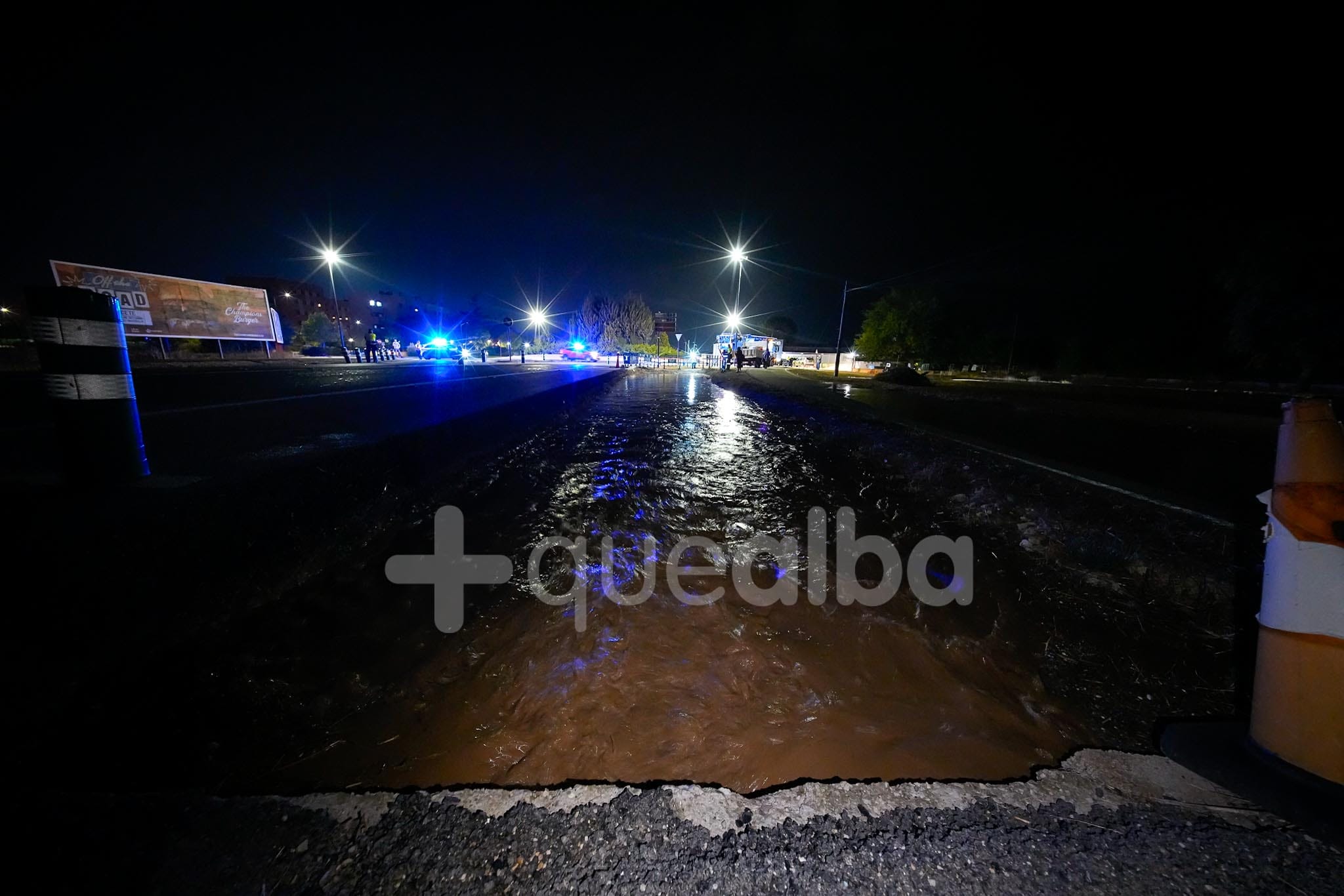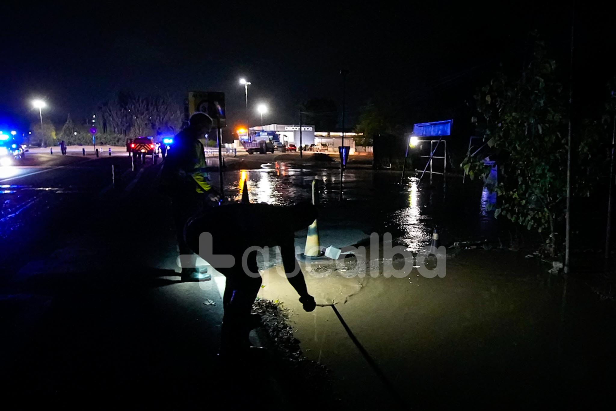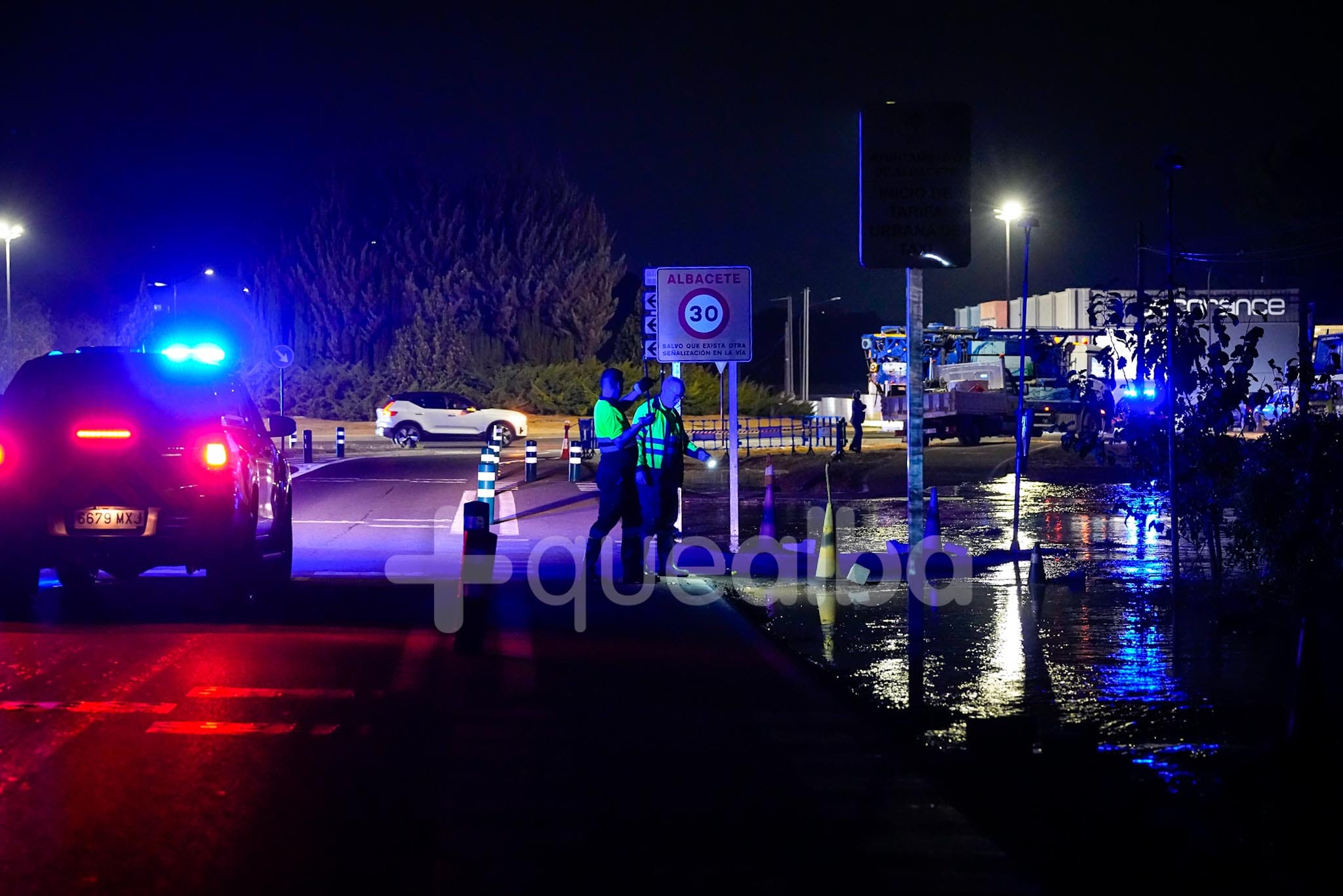 Desde alrededor de las 9 de la noche, bomberos y policía trabajan en la entrada a Albacete por la carretera de Valencia, tras la tromba de agua en Chinchilla de Montearagón, que ha vuelto a provocar inundaciones en este acceso a la ciudad por La Casita.