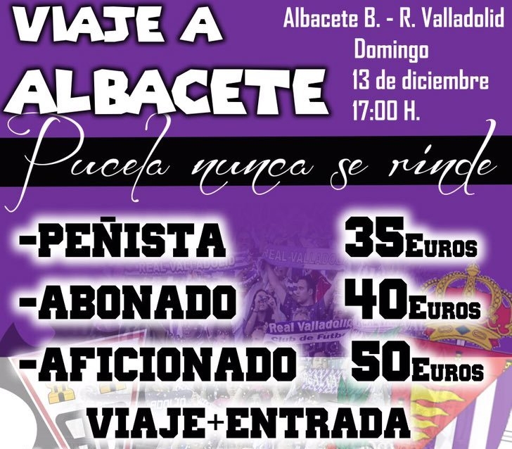La Federación de Peñas del Valladolid, próximo rival en visitar el Carlos Belmonte, ha organizado viaje para venir a Albacete, tal y como han informado a través de sus redes sociales. El Valladolid jugará en el Belmonte el domingo 13 de diciembre, a partir de las 17.00 horas, y espera contar con el apoyo de su afición en este estadio.
