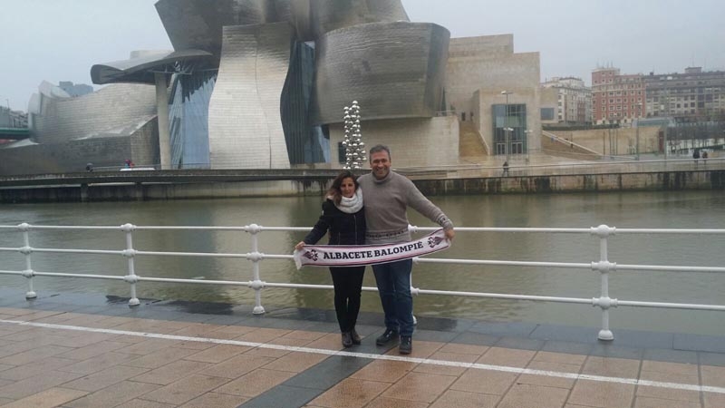 Siguen llegando hasta Bilbao para ver al Albacete Balompié aficionados blancos, como Alfonso, incondicional del Alba, que reside por el norte y que se acerca a ver al equipo siempre que puede.
