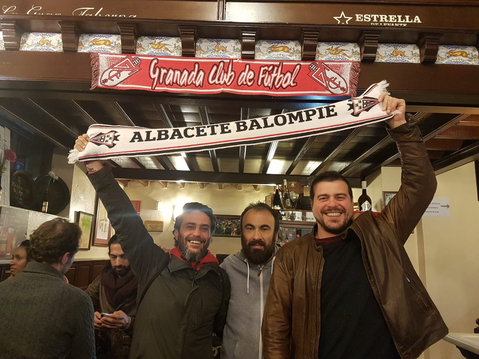 La afición del Albacete Balompié ya ha empezado a desembarcar en Granada. Ángel, amigo de esta casa, nos manda una imagen desde allí, confraternizando con seguidores del Granada. Más de 600 aficionados del Alba animarán a los de Ramis este viernes desde Los Cármenes.
