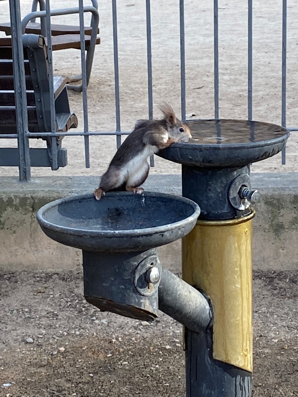 Curiosa y tierna, sin duda, esta imagen que nos remite Beatriz Rosa García, de una ardilla bebiendo agua en una fuente. La imagen está captada en el Parque Abelardo Sánchez de Albacete.