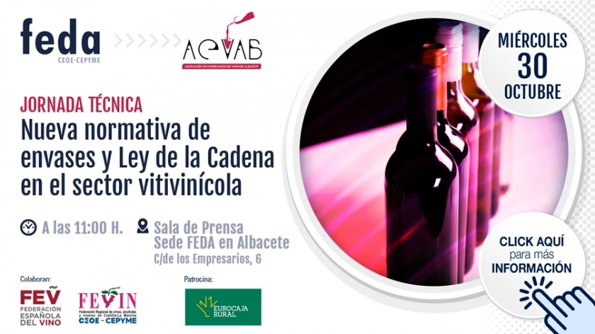 Mañana miércoles, en FEDA, como acción de promoción empresarial en el acuerdo de colaboración con Eurocaja Rural, tendrá lugar una jornada técnica de la Asociación de Empresarios de Vino de Albacete, sobre la nueva normativa de envases y la ley de la cadena alimentaria en el sector vitivinícola.