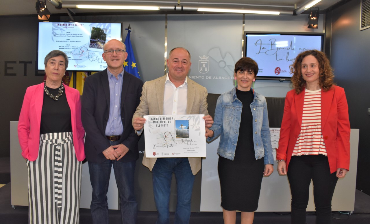 El Parque de la Fiesta del Árbol acogerá este jueves, 12 de mayo, el primero de los conciertos de La Banda en tu barrio, programa puesto en marcha por el Ayuntamiento, la Banda Sinfónica Municipal de Albacete (BSMA) y la Federación de Asociaciones de Vecinos de Albacete (FAVA). El alcalde y concejal de la BSMA, Emilio Sáez, ha presentado la programación de este ciclo de conciertos, que ya alcanza su tercera edición y que llevará la música por los barrios y pedanías de Albacete.