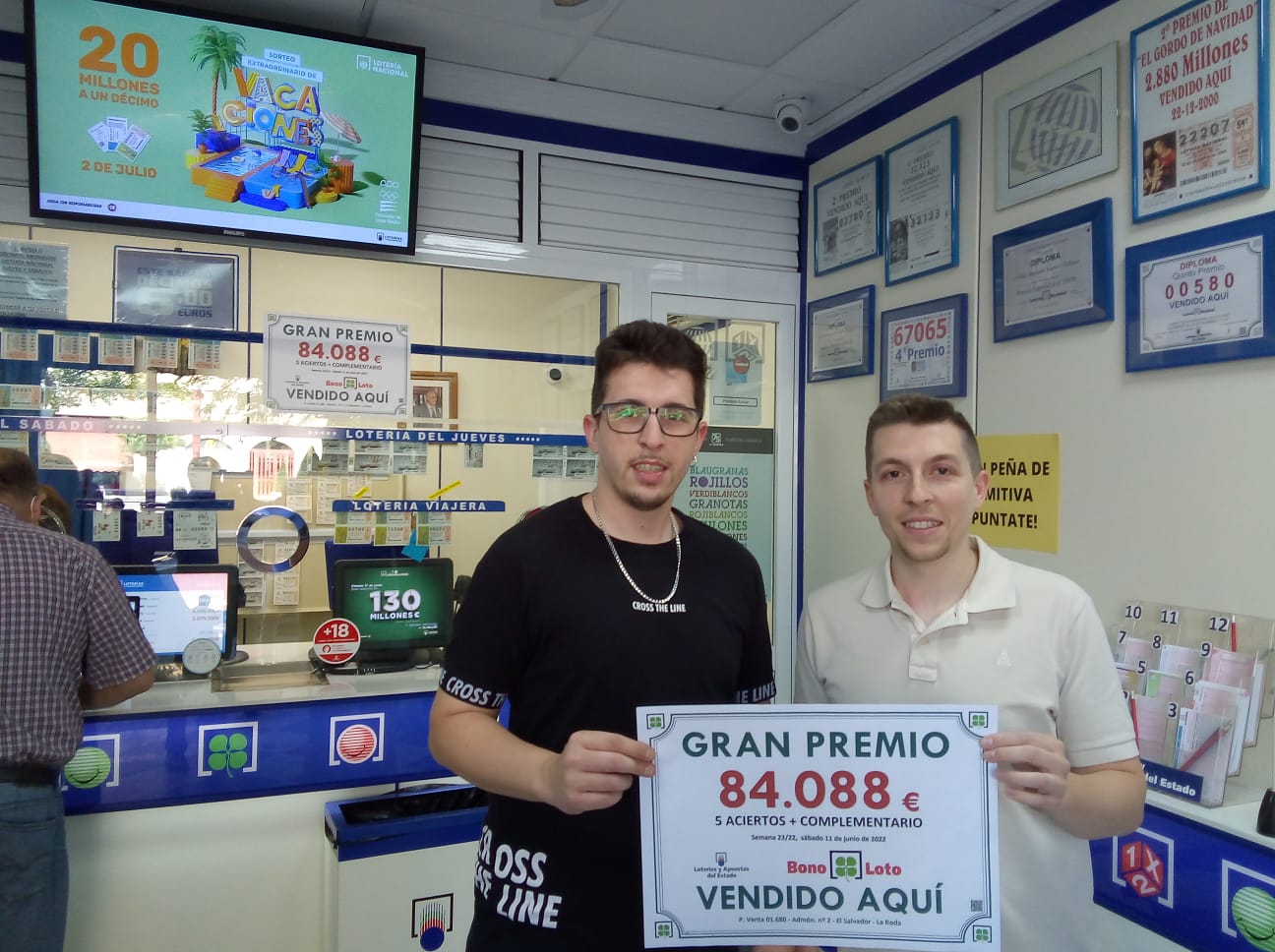 En el Sorteo de Bonoloto celebrado en la noche del sábado 11 de junio de 2022, existen tres boletos agraciados de segunda categoría 5+C. Uno de ellos fue validado en el Punto de Venta 01.680 – Administración nº2 de La Roda, ubicada en c/ Ramón y Cajal, número 3.