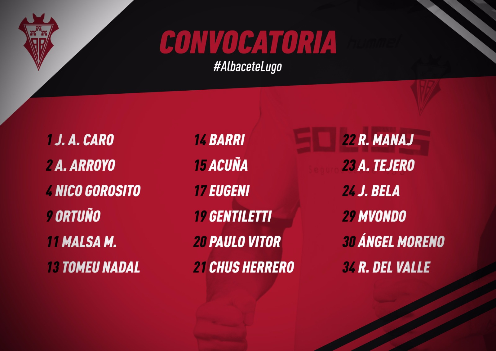 En la convocatoria destaca la presencia del jugador del Atlético Albacete Rubén del Valle, que ya hizo buena parte de la pretemporada a las órdenes del técnico, y de Ángel Moreno, un canterano habitual en los entrenamientos del primer equipo. En la nómina copera también están incluidos los dos últimos fichajes del equipo, Paulo Vitor y Gentiletti.