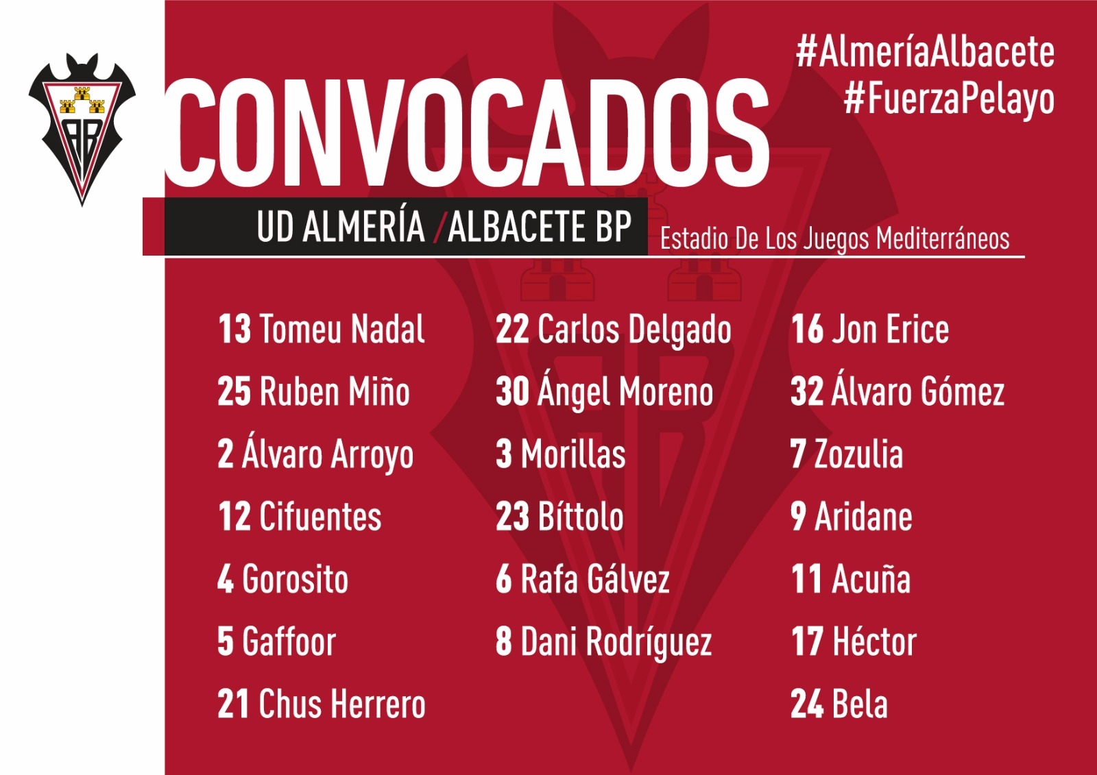 Los jugadores convocados están citados en la Ciudad Deportiva Andrés Iniesta a las 17:00 para, desde allí, salir en autobús hacia tierras almerienses. Al llegar a Almería, harán noche en el Hotel NH Ciudad de Almería, desde donde saldrán mañana camino al Estadio de Los Juegos Mediterráneos para disputar el partido, que dará comienzo a las 16:00. A la conclusión del partido, vuelta a Albacete por carretera también.