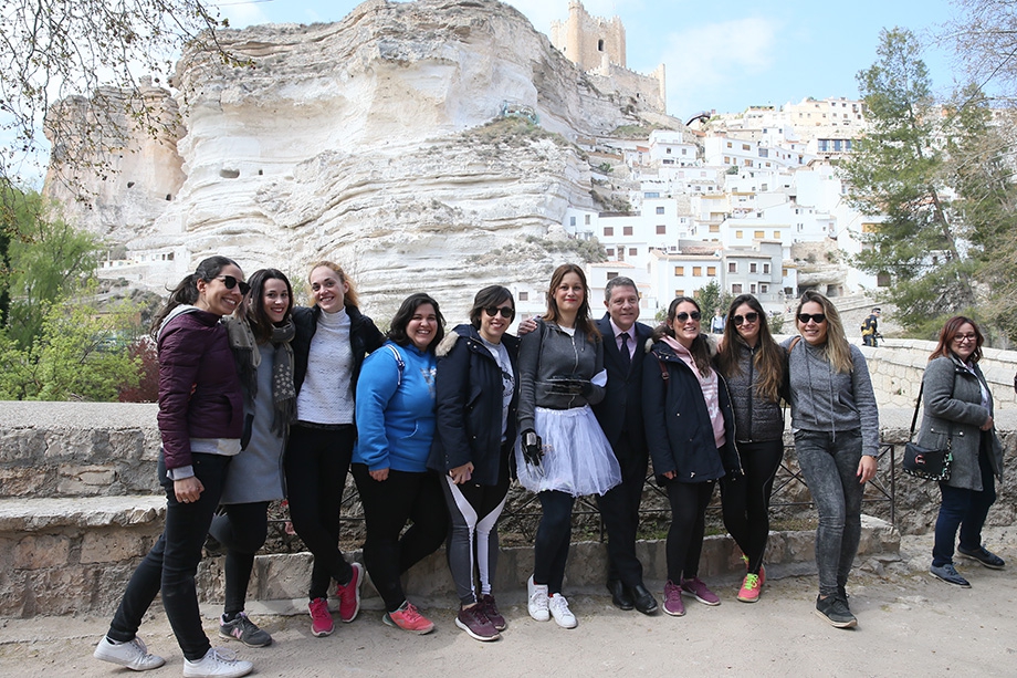 La visita del presidente de la Junta, Emiliano García-Page, a Alcalá del Júcar, municipio que forma parte de la Red de los Pueblos Más Bonitos de España, ha dejado imágenes curiosas como esta en la que ha posado con unas jóvenes que celebran una despedida de soltera.