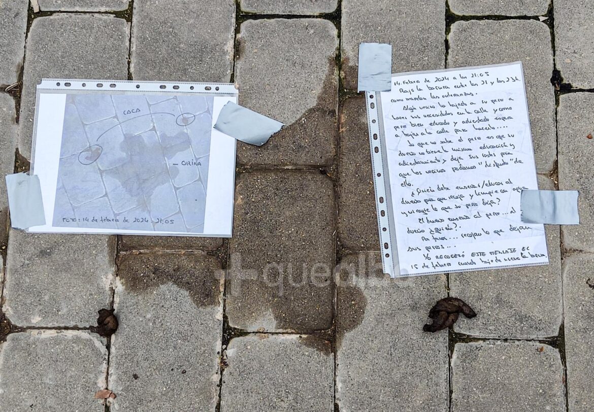 Se ha currado la queja incluso en carpeta, fijándola al suelo para que tomen conciencia e indicando que igual que la puso anoche después de bajar la basura -en el horario fijado- la recogerá este jueves, día 15, esperando que el dueño de la mascota la haya visto y rectifique su comportamiento para futuras ocasiones.