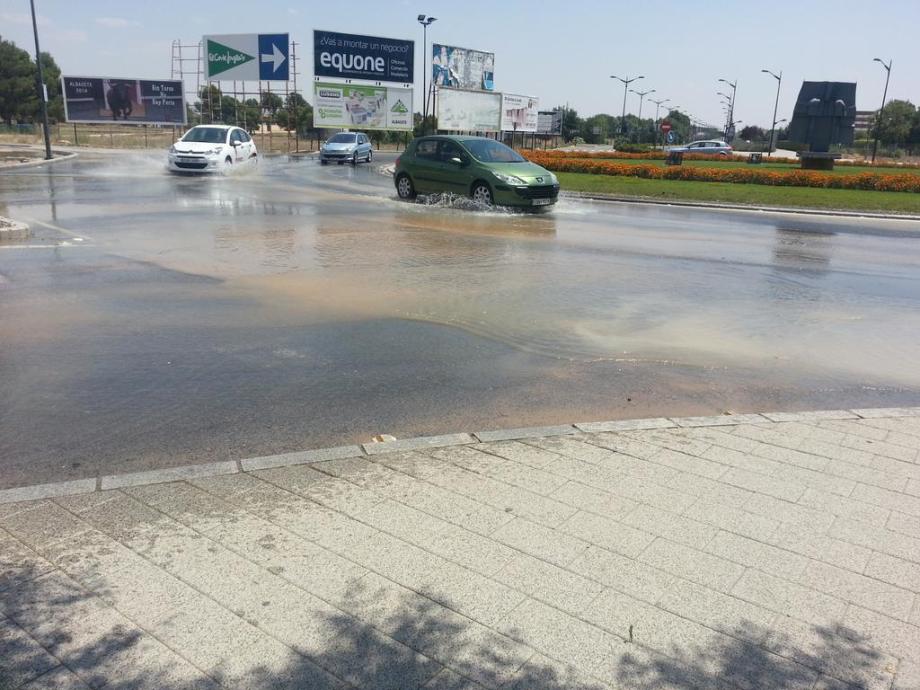 La rotura de una tubería ha provocado este mediodía que la rotonda de la Puerta de Valencia, en uno de los accesos a la ciudad de Albacete, por la carretera de Valencia, presentara este aspecto con ‘inundaciones’ en pleno julio y con alerta por altas temperaturas. @Nohe_AB nos hacía llegar la imagen por Twitter.