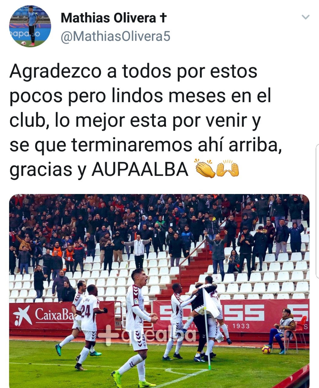 Mathías Olivera, cuya salida del Alba para volver al Getafe se hacía oficial en la medianoche de este viernes, se ha despedido hoy de la afición del Alba a través de sus redes sociales.