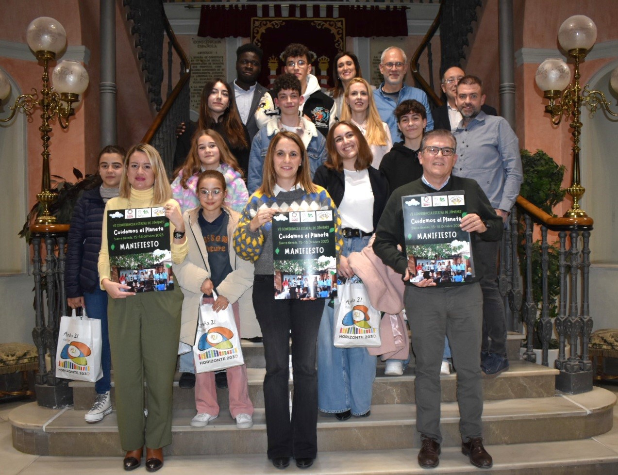 La diputada provincial responsable de la Agenda 2030 y Fondos Europeos, Yolanda Ballesteros, ha recibido en el Salón de Plenos de la Diputación de Albacete a algunos de los y las jóvenes que, en el marco de su programa Agenda 2030 Escolar (antes llamado Agenda 21 Escolar-Horizonte 2030), participaron en representación del territorio albacetense en la VI Conferencia Estatal de Jóvenes ‘Cuidemos el planeta’ (CONFINT), organizada por la Red Estatal de Escuelas hacia la Sostenibilidad en Red (EsenRED) en colaboración con el Ministerio de Educación y Formación Profesional.