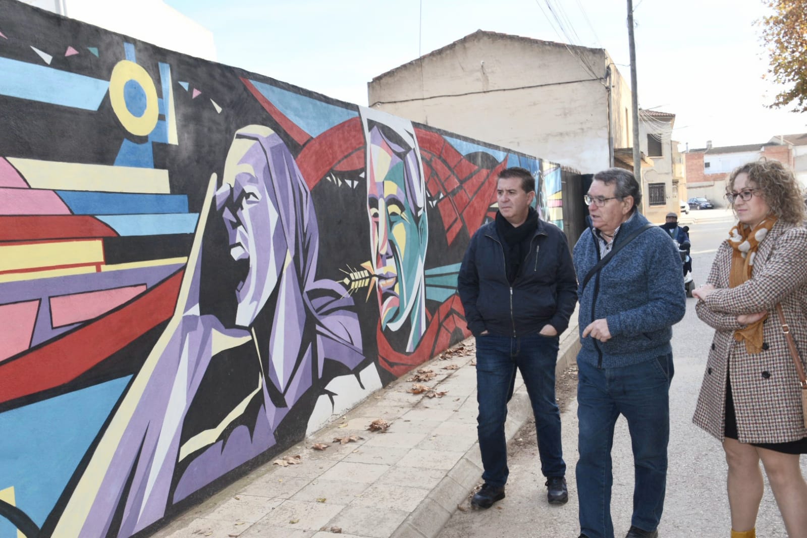 Finalmente, el autor del mural, Javier Parra, ha sido el encargado de explicar la simbología de esta obra, marcada por la fuerza cromática, en cuya parte derecha están recogidos productos locales (uva, almendra, champiñón…) y en la parte de la izquierda las propias cooperativas. Estando reservada la parte central para los hombres y mujeres que las hicieron y las hacen posible, representados, tal y como ha explicado el artista, a través de dos rostros “que llaman al pueblo a unirse y constituir cooperativas”.