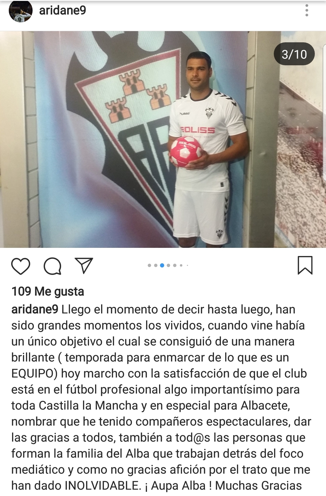 Aridane, ya exjugador del Albacete Balompié, ha publicado una carta en sus redes sociales para despedirse se la afición con un «hasta luego».