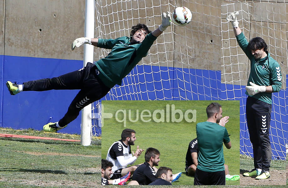 El entrenador de porteros Carlos Cano se puso los guantes en el entrenamiento del Albacete Balompié para demostrar que el que tuvo, retuvo