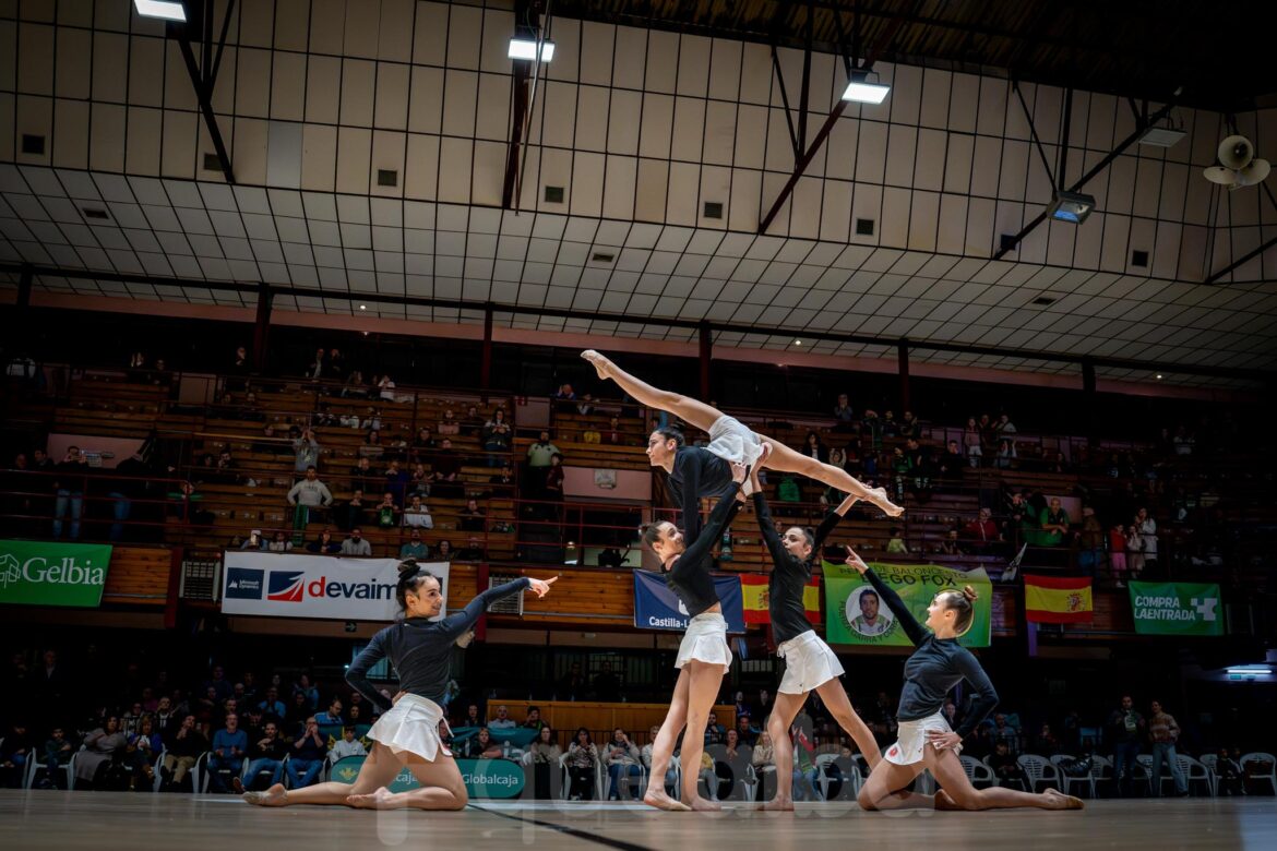 El equipo junior absoluto de gimnasia rítmica del Club Palas E.C., que se proclamó Campeón de España, ha sido este sábado protagonista en el Pabellón del Parque de Albacete, en el encuentro que disputaban el Bueno Arenas Albacete Basket y el Teknei Bizkaia Zornotza.