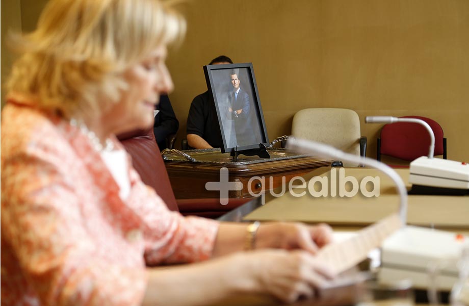 El Salón de Plenos del Ayuntamiento ya ha cambiado la foto del Rey Juan Carlos por la de su hijo, el nuevo Rey Felipe VI. Así lo hemos podido ver en el Debate sobre el Estado del Municipio, aunque de momento la foto es mucho más reducida que la que había de su padre.