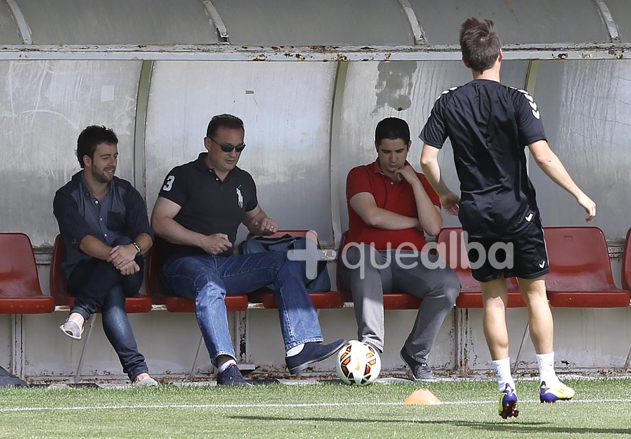 Al presidente del Albacete Balompié, José Miguel Garrido, le hemos visto esta semana por los entrenamientos de la Ciudad Deportiva, e incluso en el banquillo, acompañado por ejemplo del secretario técnico, Víctor Moreno. Pero a ellos el míster, Luis César, no los puso a correr ni a ‘chupar’ banquillo por no estar en forma, solamente buscaron una buena sombra para poder seguir mejor el desarrollo de la jornada matinal.