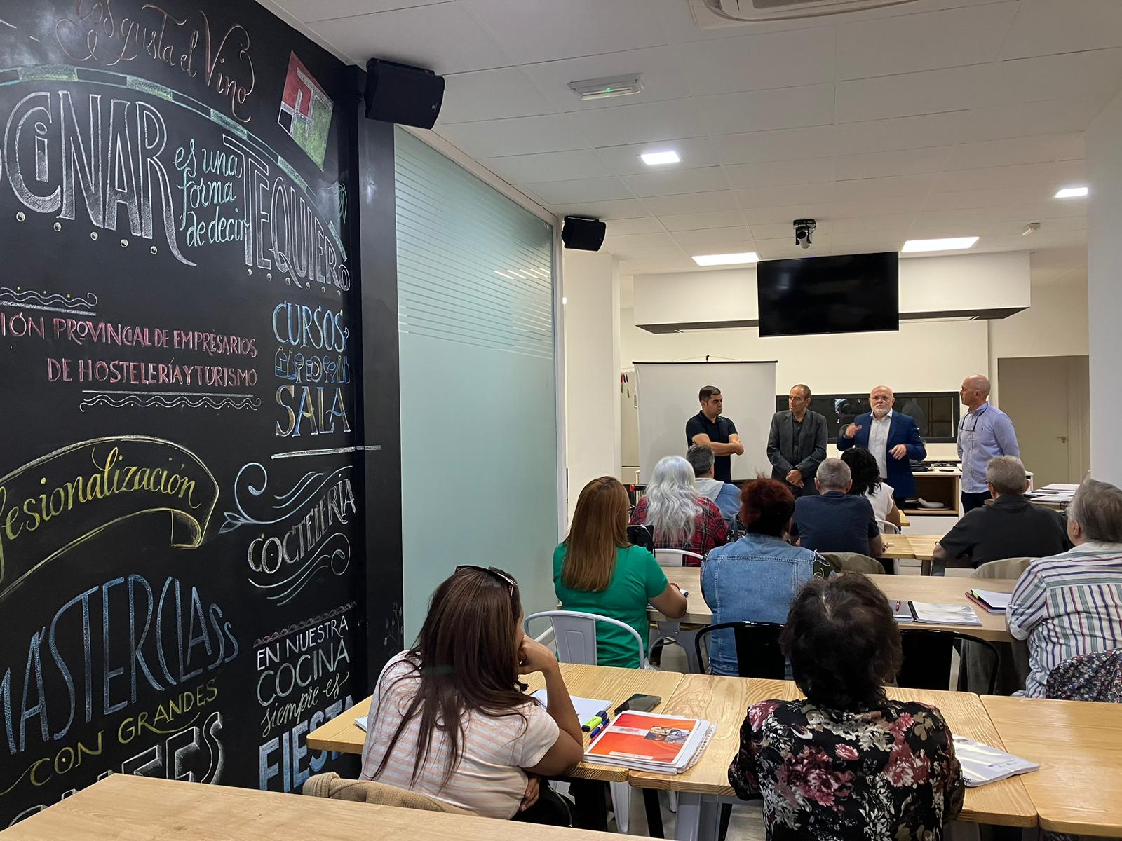 El delegado de la Junta en Albacete, Pedro Antonio Ruiz Santos y el presidente de la APEHT, David Giménez acompañado del delegado provincial de Economía, Empresas y Empleo, Nicolás Merino han visibilizado esta cooperación público-privada, durante la visita que han realizado hoy, a los cursos de formación impulsado por esta asociación profesional, en su Aula Formativa en la ciudad de Albacete, donde imparten cursos con entidades y profesionales de referencia en el sector en diferentes modalidades, tanto presencial como a distancia, apostando por la recualificación y la adaptación a las nuevas demandas dentro de la hostelería y la restauración.