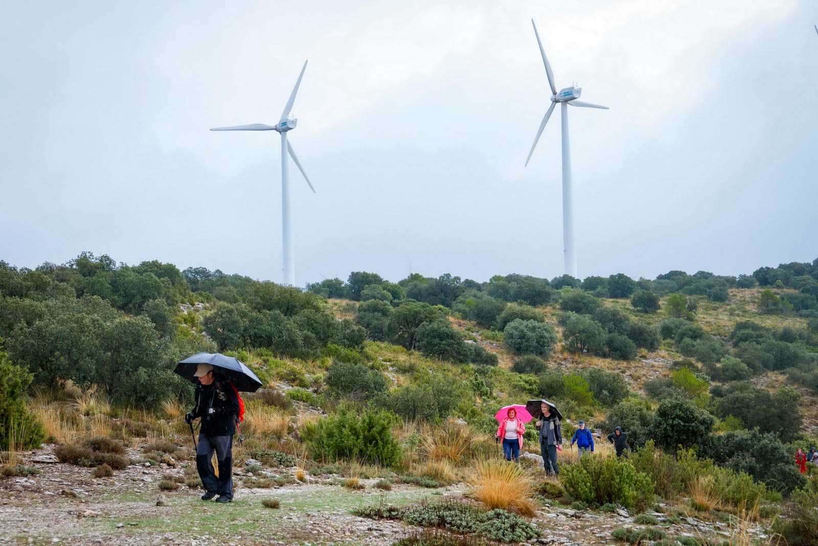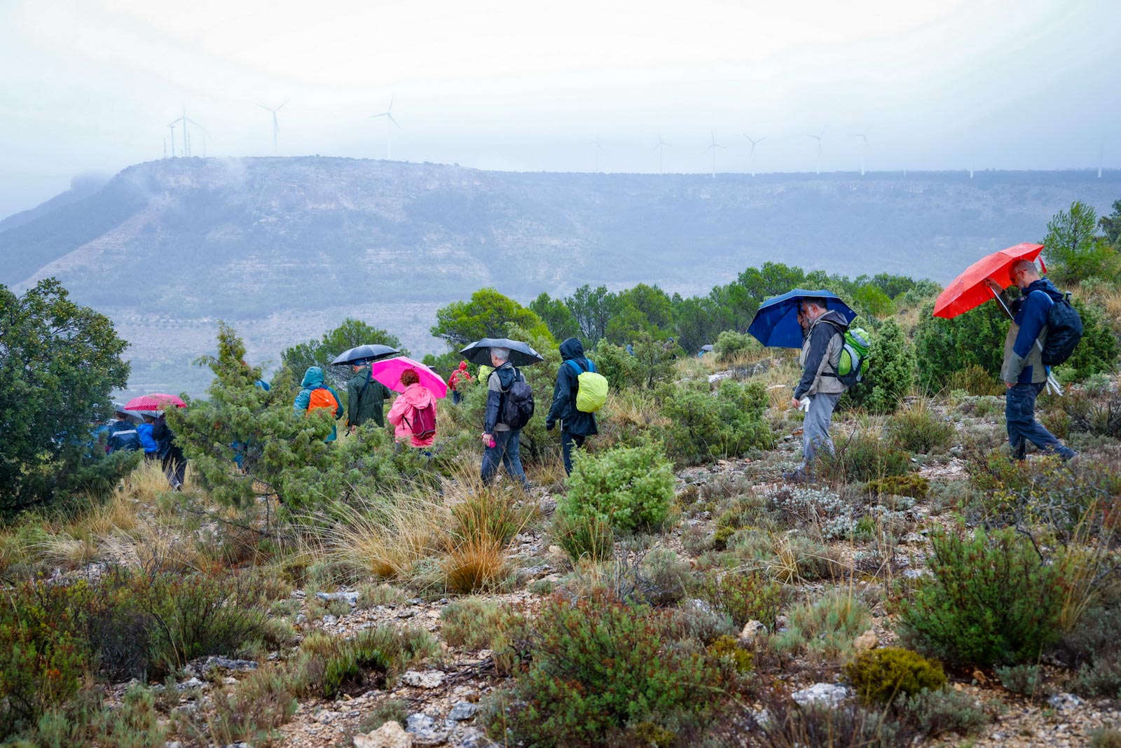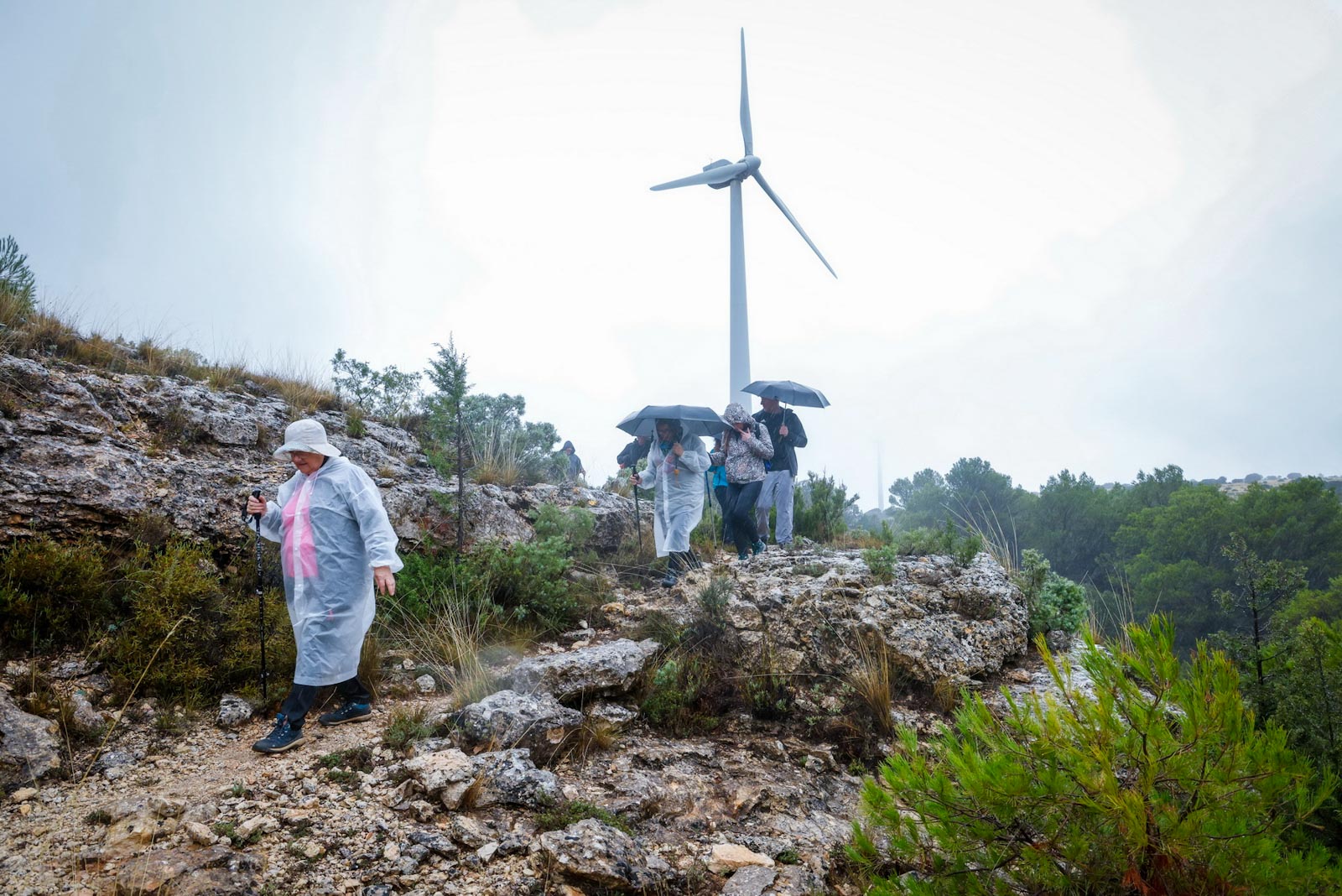 Comenzaron de nuevo el ascenso, tras pasar por la fuente “El Reguero de los Pollos”, con la lluvia que no cesaba. Aunque si se oían el girar de los aerogeneradores, en un principio, debido a la niebla no se veían, fue al llegar a la parte alta cuando se chocaron con ellos. Llegarían a un viejo corral de ganado, donde, ya de regreso al municipio, cogerían un camino que les conduce a otro collado que da vistas al pueblo de Carcelén y empezaría a bajar por una senda de herradura, hasta casi llegar al pueblo por un paraje conocido como Rincón de las Eras, a unos 300 metros de Carcelén. Llegarían así hasta el Lavadero municipal de Carcelén, junto a un espacio de recreo habilitado como zona de barbacoa y merendero. En este mismo lugar, se encuentra la fuente “Los Pimenteros”, lugar que aprovechamos para almorzar.