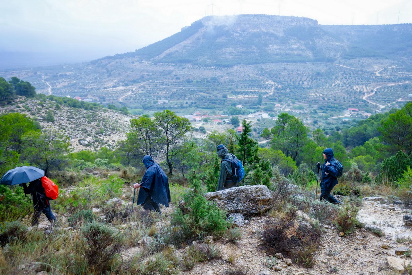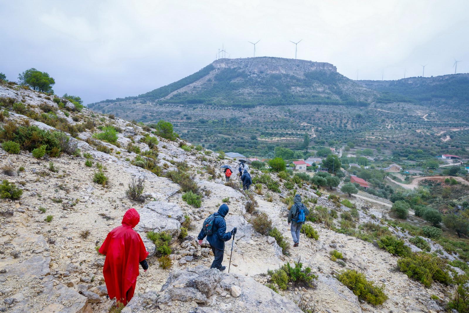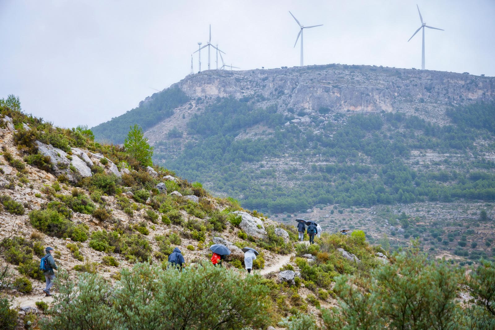 Comenzaron de nuevo el ascenso, tras pasar por la fuente “El Reguero de los Pollos”, con la lluvia que no cesaba. Aunque si se oían el girar de los aerogeneradores, en un principio, debido a la niebla no se veían, fue al llegar a la parte alta cuando se chocaron con ellos. Llegarían a un viejo corral de ganado, donde, ya de regreso al municipio, cogerían un camino que les conduce a otro collado que da vistas al pueblo de Carcelén y empezaría a bajar por una senda de herradura, hasta casi llegar al pueblo por un paraje conocido como Rincón de las Eras, a unos 300 metros de Carcelén. Llegarían así hasta el Lavadero municipal de Carcelén, junto a un espacio de recreo habilitado como zona de barbacoa y merendero. En este mismo lugar, se encuentra la fuente “Los Pimenteros”, lugar que aprovechamos para almorzar.