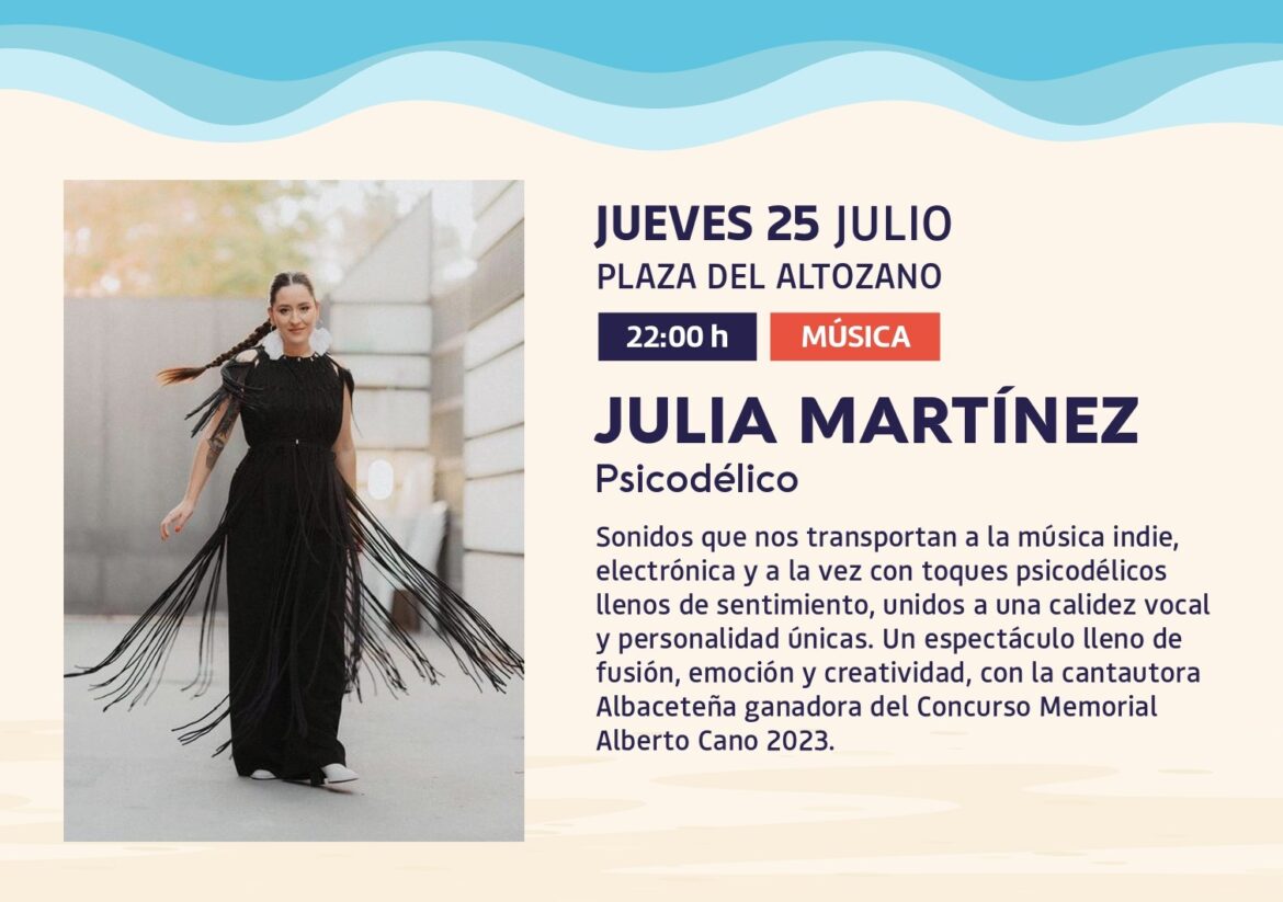 Sigue la programación del verano cultural del Ayuntamiento de Albacete con la actuación de Julia Martínez, este jueves, 25 de julio a las 22.00 en la Plaza del Altozano.