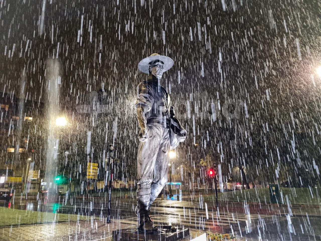 Nieva desde hace cerca de dos horas en la ciudad de Albacete, con más intensidad desde las 21 horas, y la nieve ya deja imágenes tan espectaculares en la capital -en pleno abril- como la del Sembrador cubierto de copos.