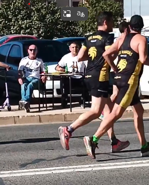 Disfrutando de un aperitivo, en una mesa improvisada al sol, frente a la zona que sí es de bares, se han instalado para dar ánimos a cuantos pasaban por este punto de la carrera.