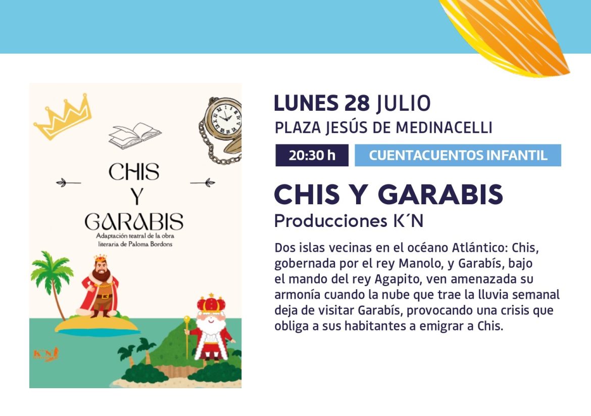 La magia de los cuentos viajará mañana lunes, 28 de julio, hasta la Plaza Jesús de Medinacelli con la representación de Chis y Garabís, una adaptación teatral de la obra literaria de Paloma Bordons a cargo de Producciones K´N y que dará comienzo a las 20:30 horas.