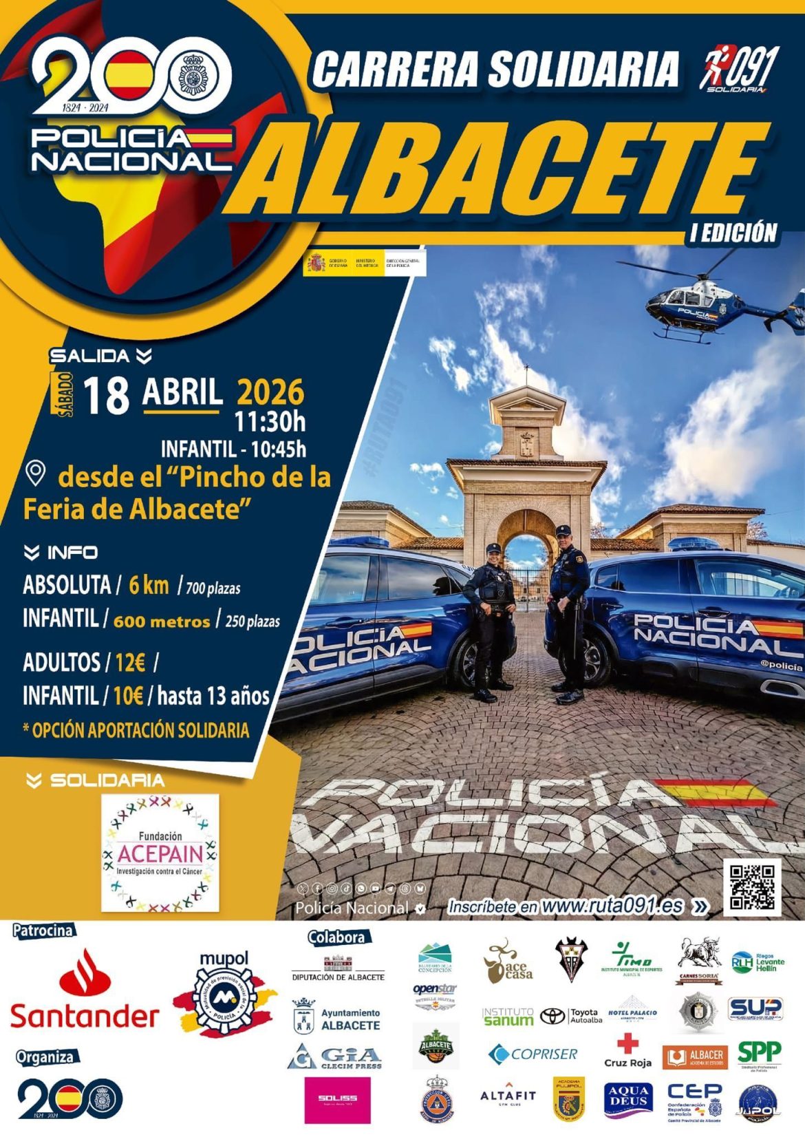 El 18 de abril de 2026, la Comisaría Provincial de la Policía Nacional en Albacete celebra la Carrera Solidaria “Ruta 091” de Albacete, con la autorización del Ayuntamiento de Albacete. Todos los beneficios irán destinados a la Fundación ACEPAIN, entidad sin ánimo de lucro dedicada a la investigación y lucha contra el cáncer.