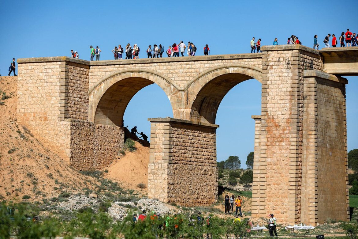 Entre viñedos llegarían hasta la Caseta de la Vía, una de las dos estaciones construidas en Fuentealbilla para la línea Baeza-Utiel, continuaron por la Vía Verde que comunica los 25 viaductos construidos, hasta llegar a uno de estos viaductos que se encuentra en Fuentealbilla, con una longitud de 138,6 metros y debe su nombre al paraje en que se edificó, la Cañada del Cardenal, que antaño fue un río y ruta de importante comunicación muy utilizada en la época ibérica y romana. Lugar que aprovecharon para almorzar, con bebida fresca, gracias al Ayuntamiento que les iba abasteciendo durante toda la ruta.