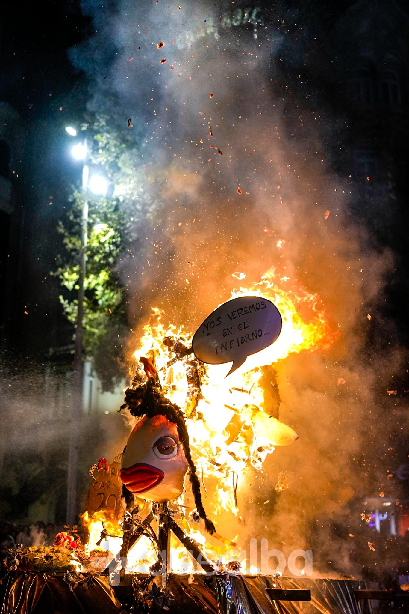 Después del velatorio en la calle San José de Calasanz, donde viudas y acompañantes han podido comerse unas pulgas de sardina para aliviar el duelo, el cortejo fúnebre y festivo ha recorrido la calle Ancha hasta llegar a la Plaza del Altozano, donde se ha celebrado la sentencia y la quema de la Sardina.