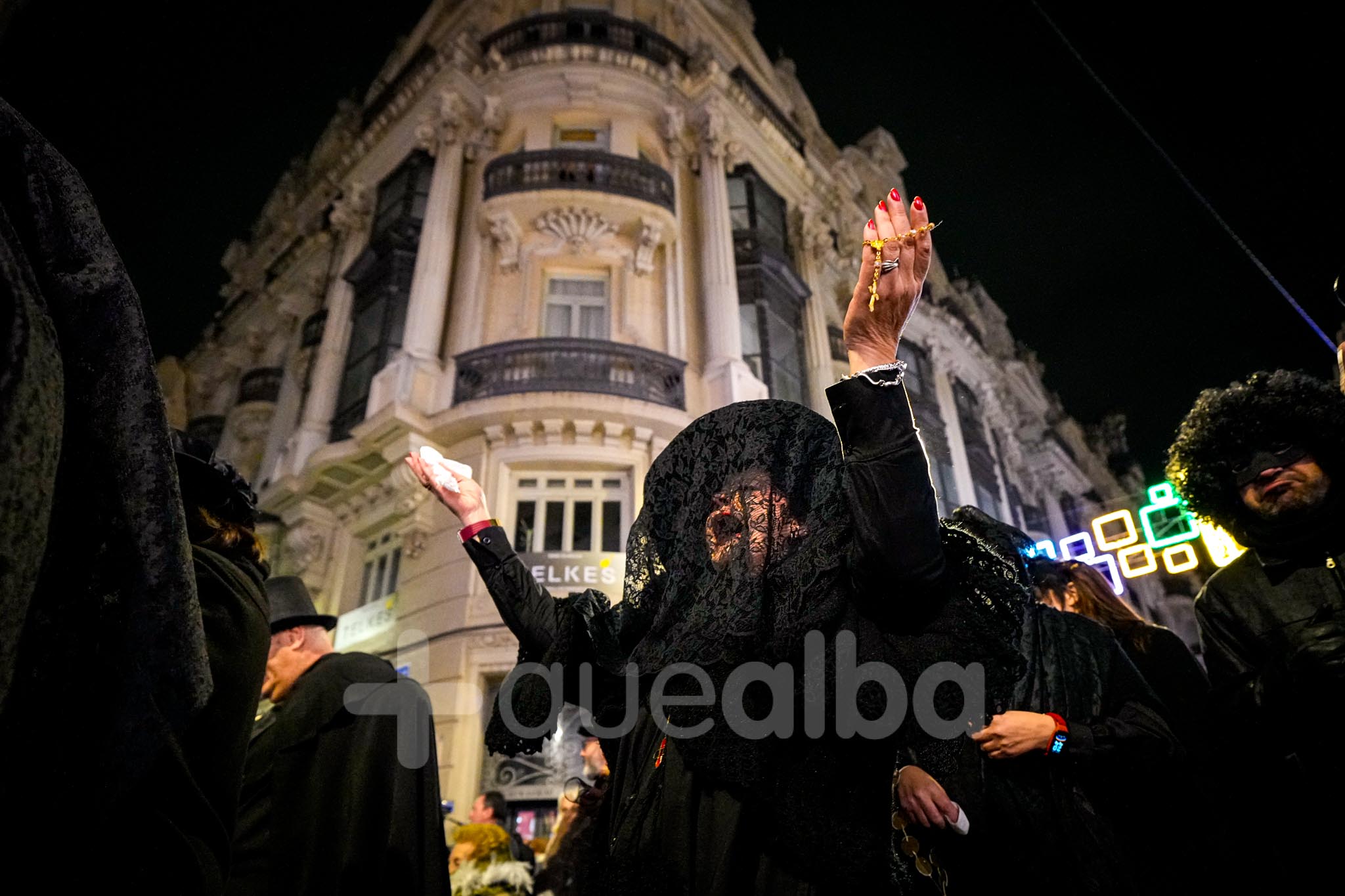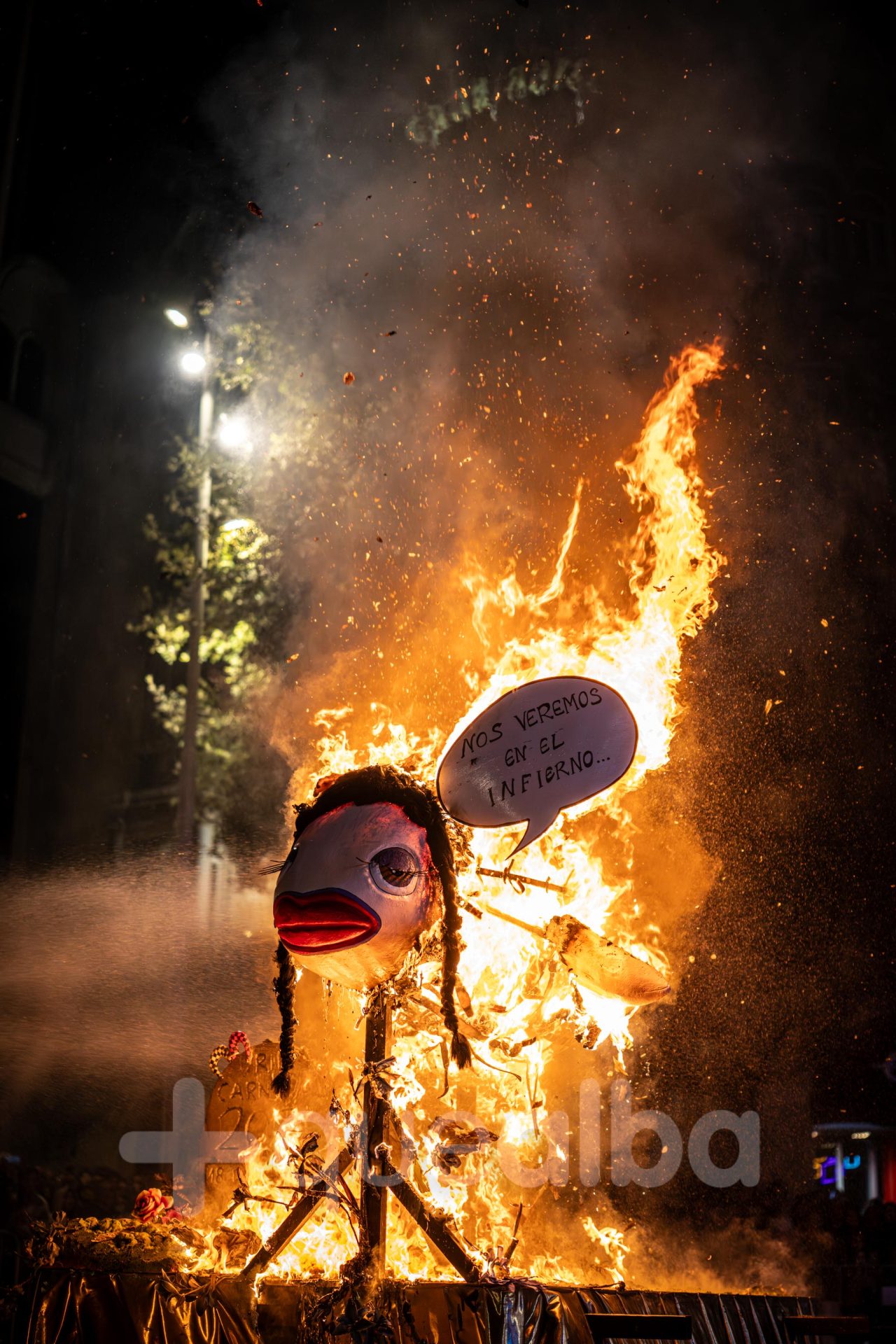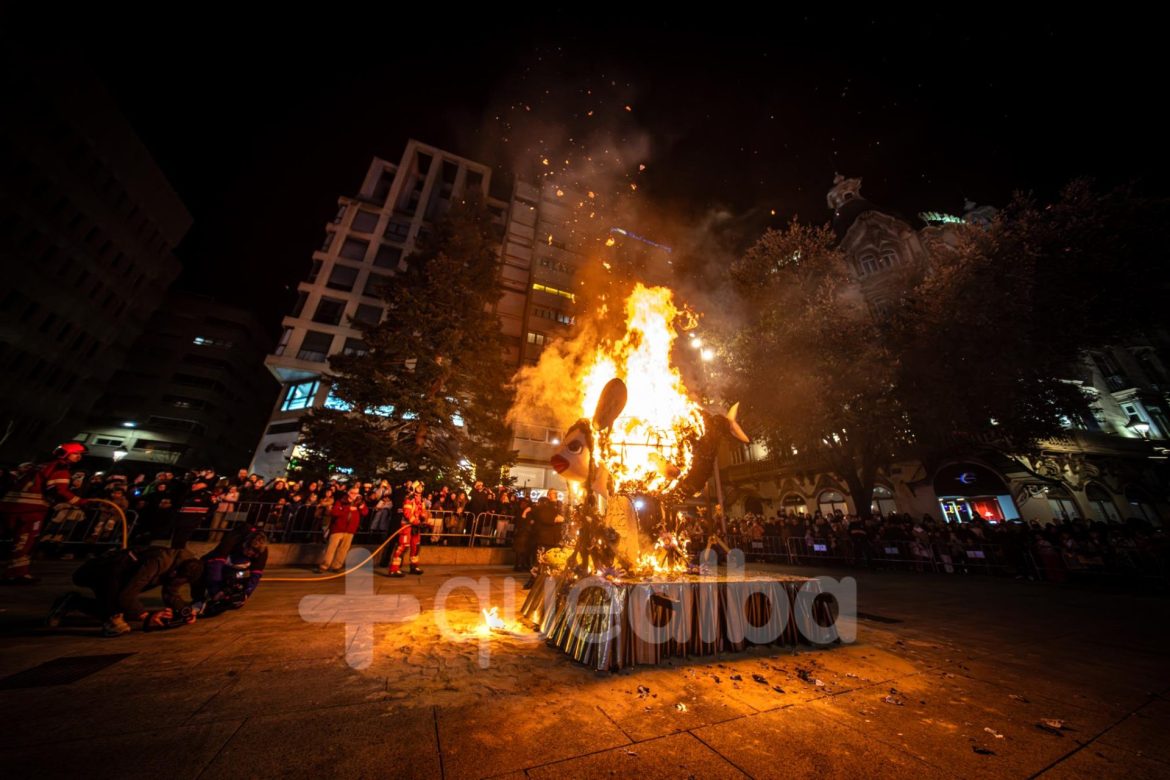 Después del velatorio en la calle San José de Calasanz, donde viudas y acompañantes han podido comerse unas pulgas de sardina para aliviar el duelo, el cortejo fúnebre y festivo ha recorrido la calle Ancha hasta llegar a la Plaza del Altozano, donde se ha celebrado la sentencia y la quema de la Sardina.