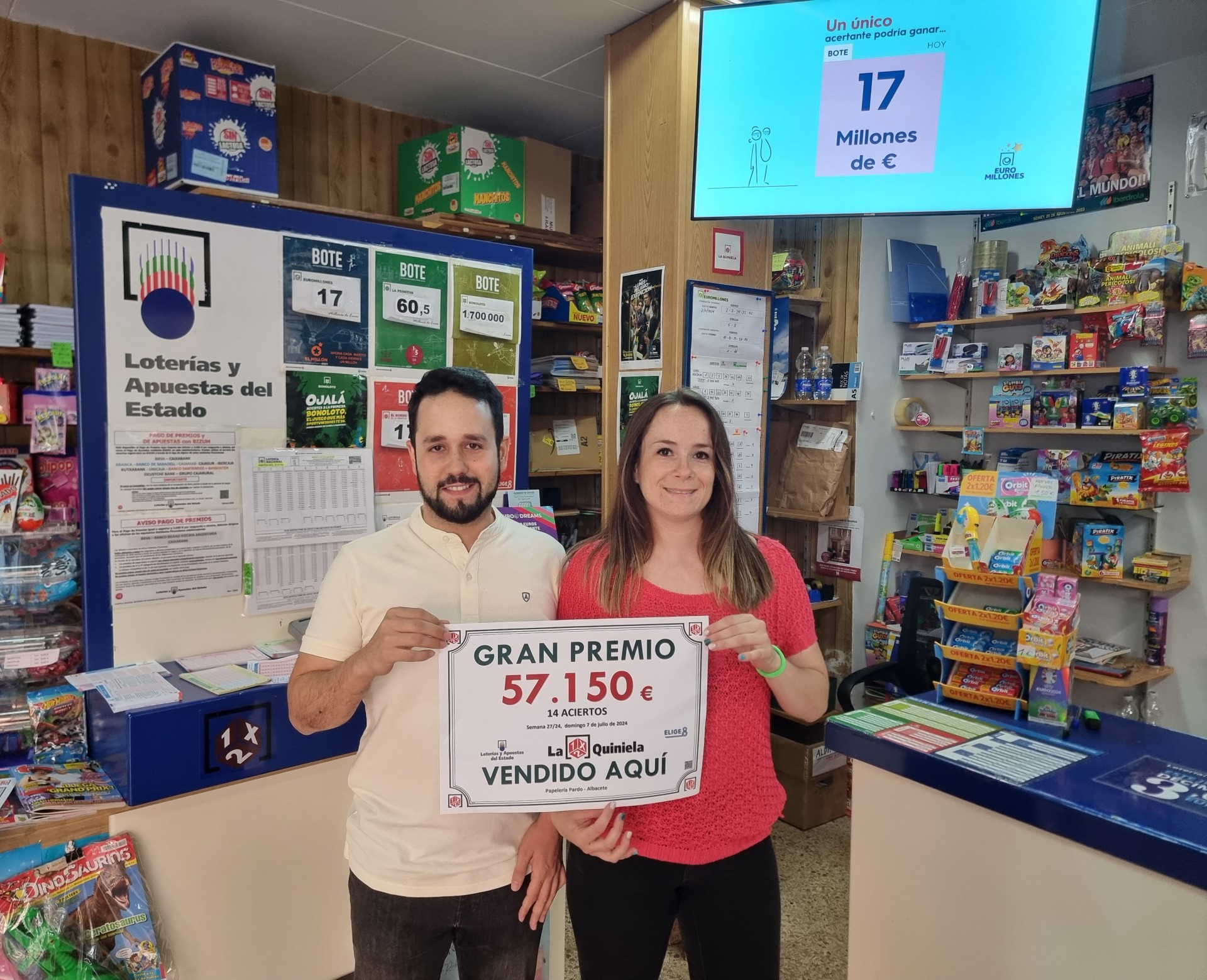 En la Jornada 65ª de “La Quiniela” de fecha 07 de julio de 2024, han aparecido dos acertantes de 14 aciertos Siendo uno de ellos validado en el Punto de Venta Mixto 01.165, “Papelería Pardo”, ubicado en Calle Torres Quevedo, 63 de Albacete. El boleto premiado cobrará la cantidad de 57.149,88 euros. Este establecimiento tiene en su haber varios premios importantes en los diferentes juegos.