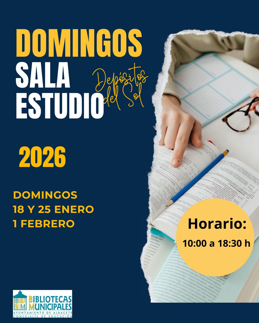 El concejal de Educación y Bibliotecas, Pascual Molina, ha informado que la sala de estudio de los Depósitos del Sol abrirá sus puertas de manera extraordinaria los próximos domingos días 18 y 25 de enero y 1 de febrero, en horario de 10:00 a 18:30 horas.